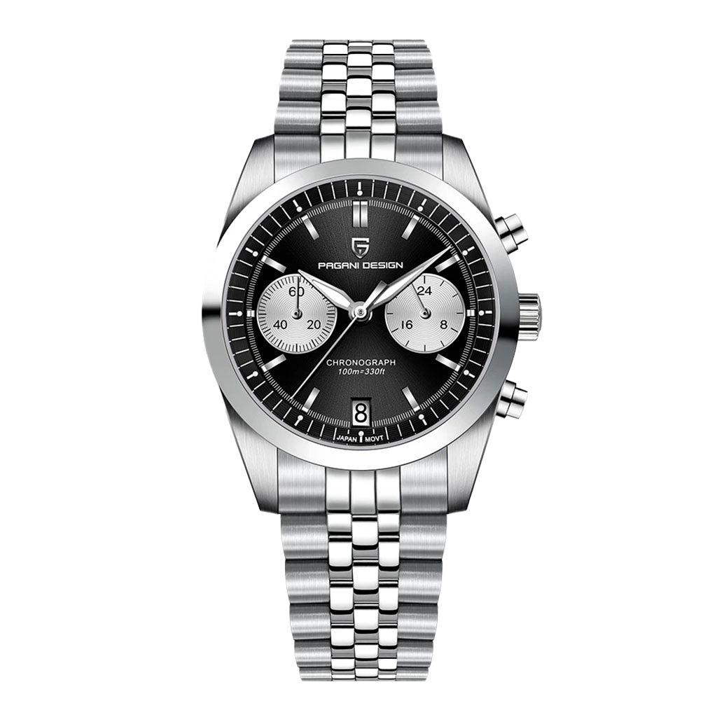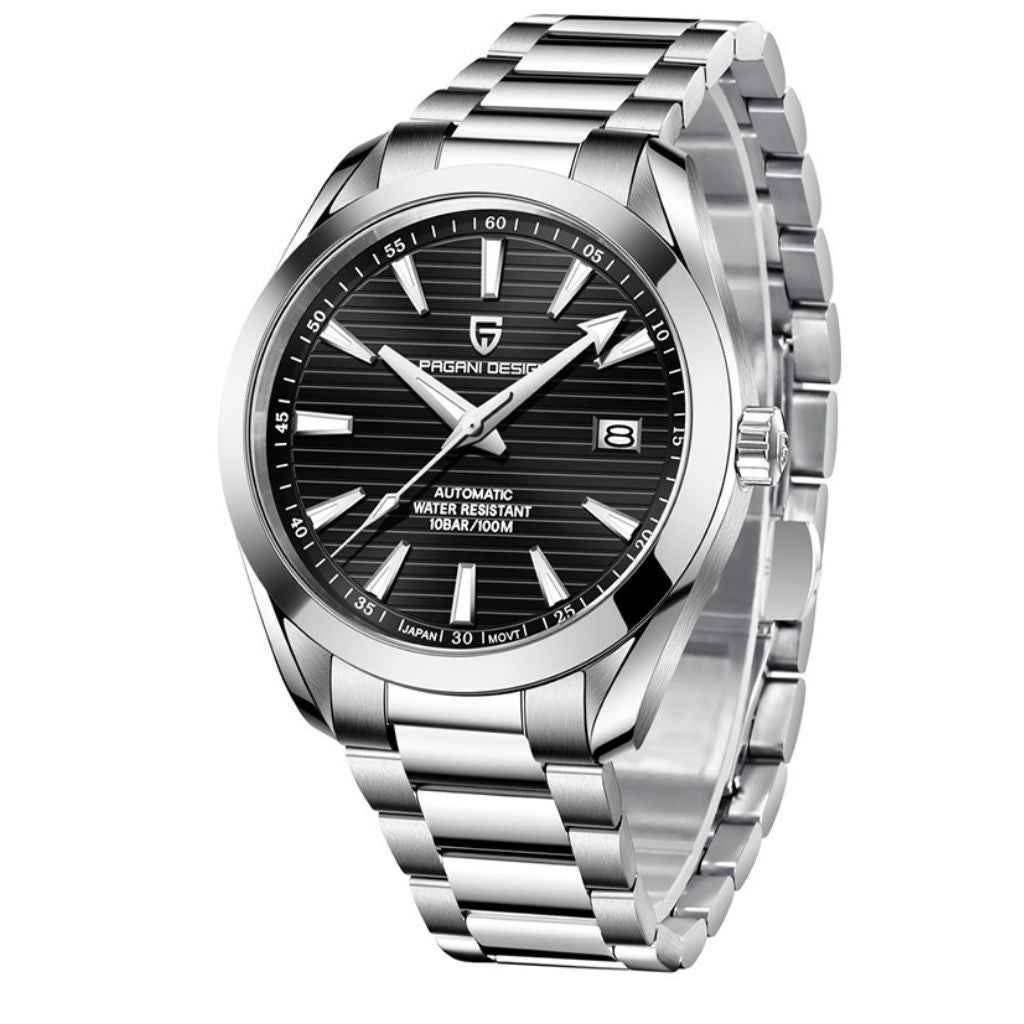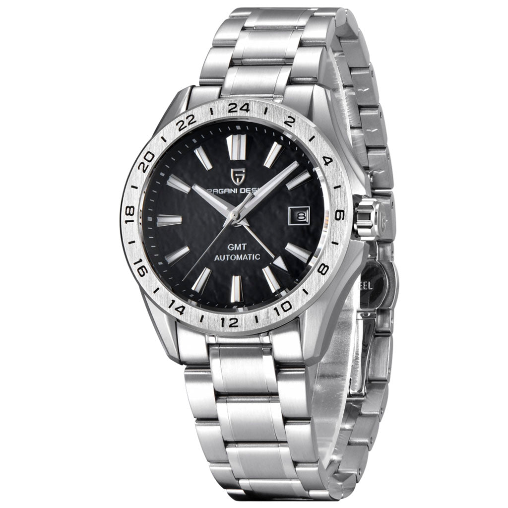 Eigenschaften Garantie1 JahrDurchmesser39,5mmDicke13,5mmGewicht154,5gWasserbeständigkeit100mUhrwerkAutomatik, Pearl DG5833GMTHerstellungPagani Design™KaliberPearl DG5833GMTFunktionStunden, Minuten und SekundenGangreserveCa. 45 Stunden WASSERDICHT BIS ZU...