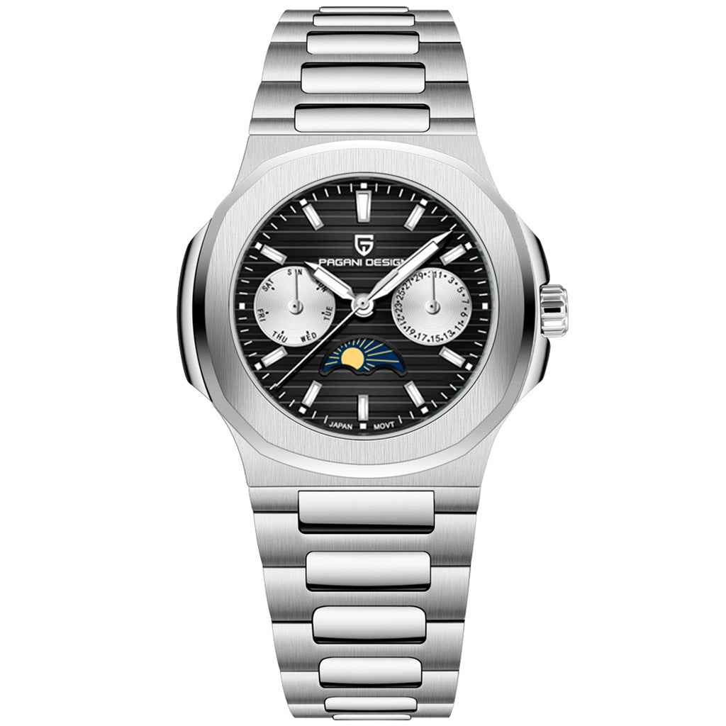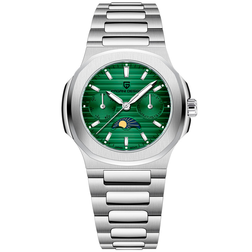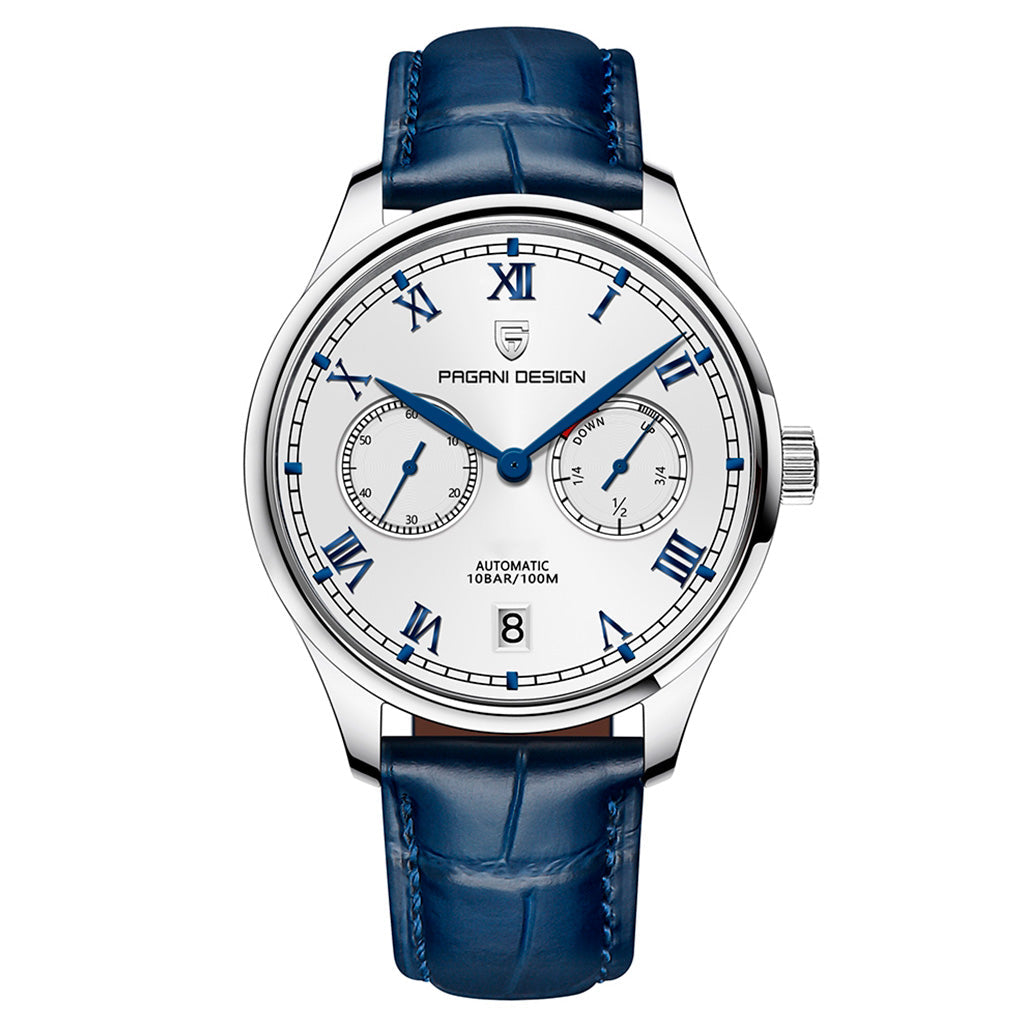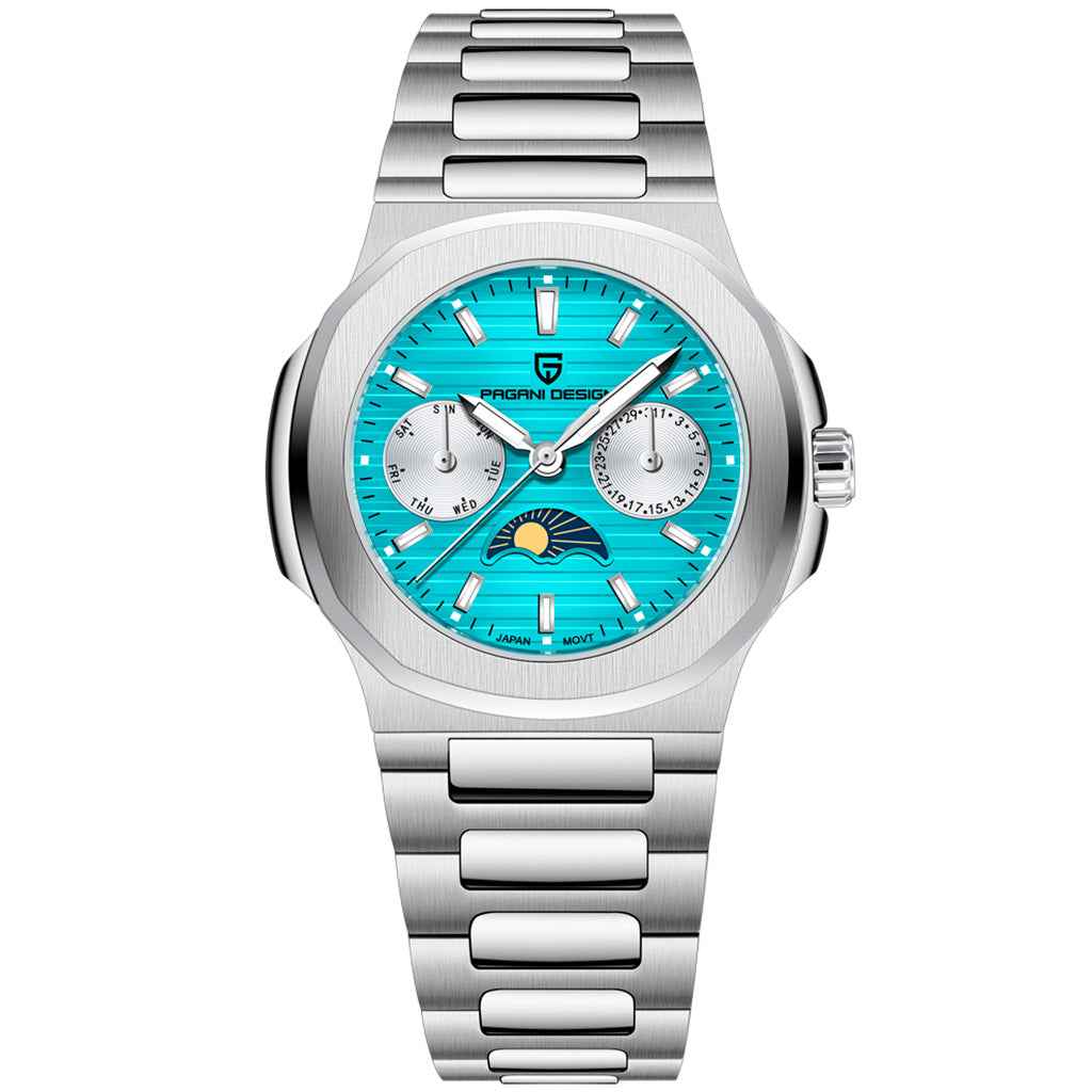Eigenschaften Garantie1 JahrDurchmesser36mmDicke10,8mmGewicht64gWasserdichtigkeit50mUhrwerkQuarz, TMI VD55HerstellungPagani Design™KaliberJapan TMI VD55FunktionStunden, Minuten und SekundenGangreserveNicht anwendbar ELEGANZ, DIE IHREN...