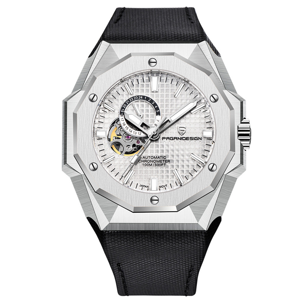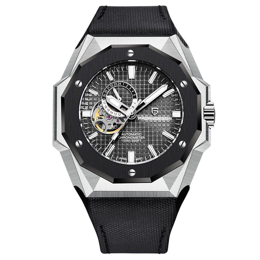 Eigenschaften Garantie1 JahrDurchmesser39,5mmDicke13,5mmGewicht154,5gWasserbeständigkeit100mUhrwerkAutomatik, Pearl DG5833GMTHerstellungPagani Design™KaliberPearl DG5833GMTFunktionStunden, Minuten und SekundenGangreserveCa. 45 Stunden WASSERDICHT BIS ZU...