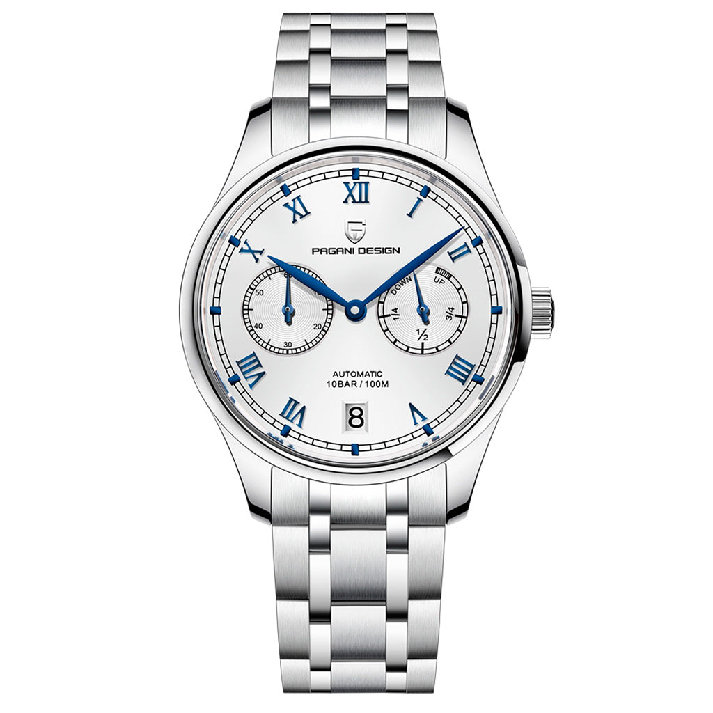 Eigenschaften Garantie1 JahrDurchmesser41 mmDicke13 mmGewicht81 gWasserdichtigkeit100 mUhrwerkAutomatik, CALC.2C-22HerstellungPagani Design™KaliberCALC.2C-22FunktionStunden, Minuten und SekundenGangreserveCa. 48 Stunden WASSERDICHT...