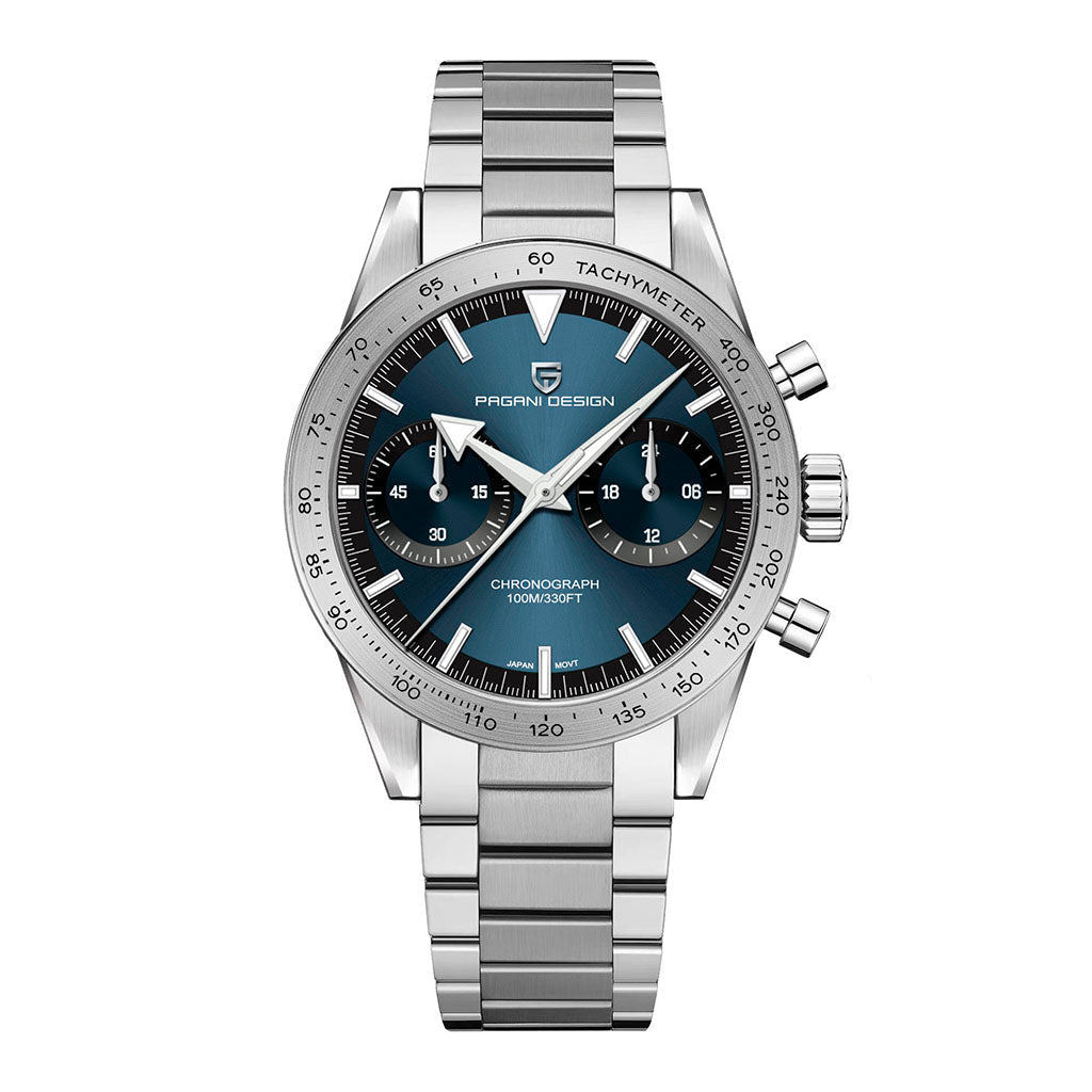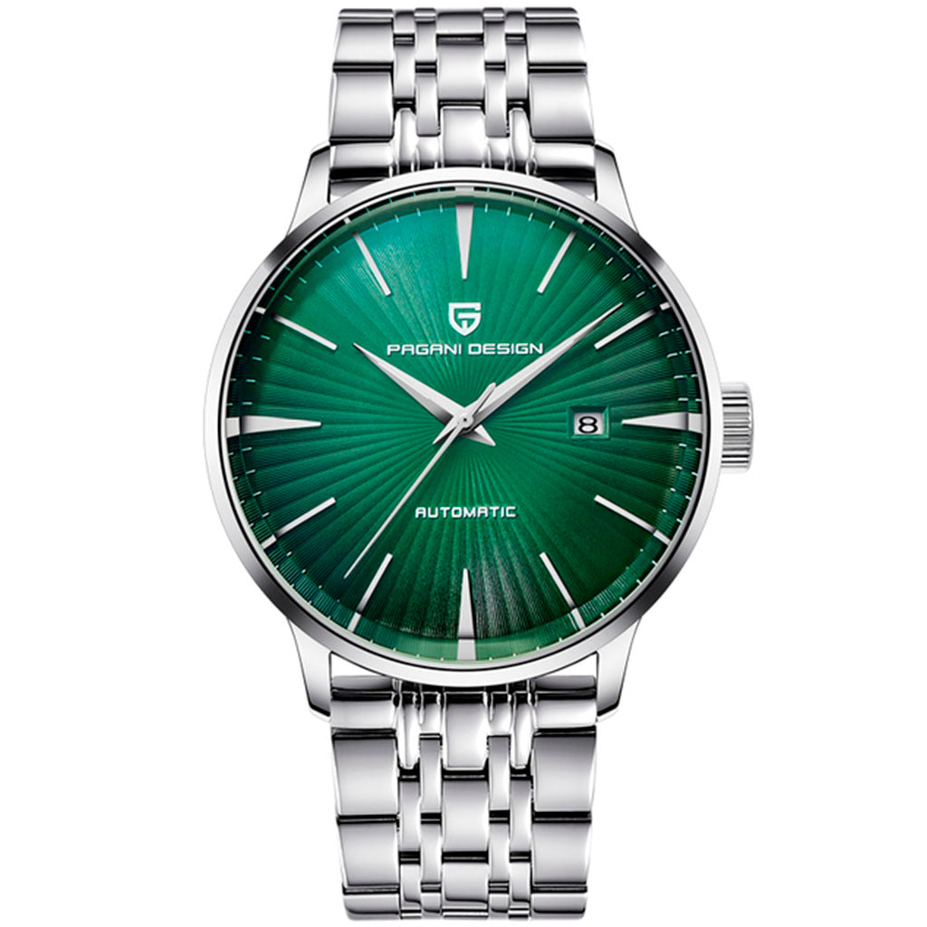 Eigenschaften Garantie1 JahrDurchmesser38 mmDicke11,7 mmGewicht85,5 gWasserbeständigkeit100 mUhrwerkAutomatik, B-Y 9020ArmbandmaterialKunstlederFunktionenStunden, Minuten und SekundenGangreserveCa. 45 StundenHerstellungPagani Design...