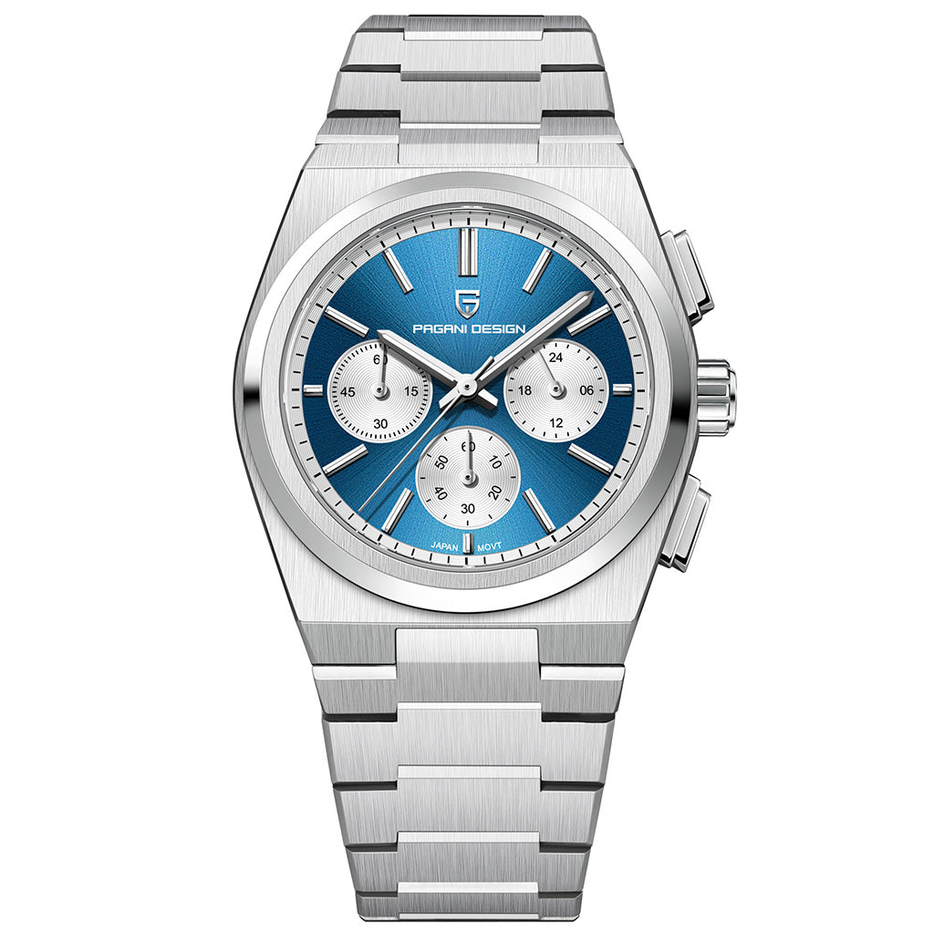 Eigenschaften Garantie1 JahrDurchmesser38 mmDicke11,7 mmGewicht85,5 gWasserbeständigkeit100 mUhrwerkAutomatik, B-Y 9020ArmbandmaterialKunstlederFunktionenStunden, Minuten und SekundenGangreserveCa. 45 StundenHerstellungPagani Design...