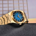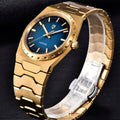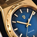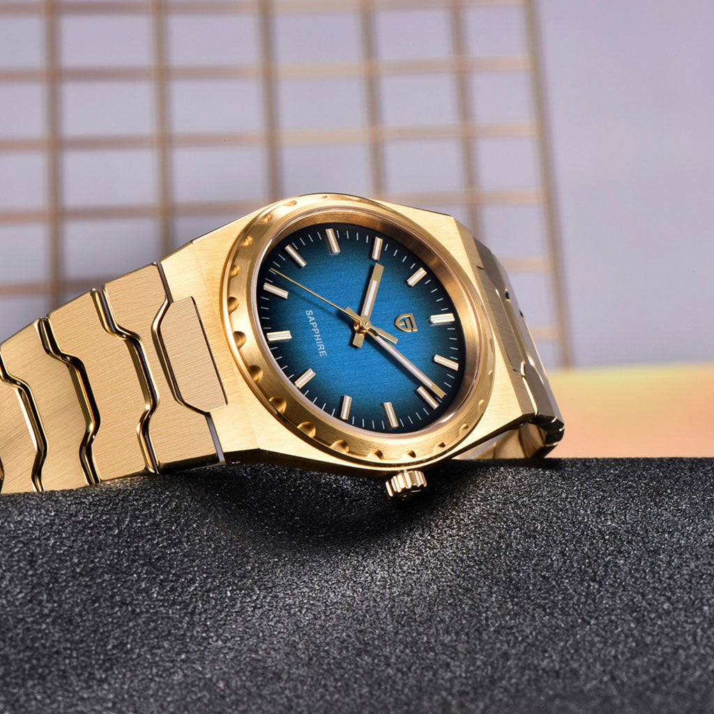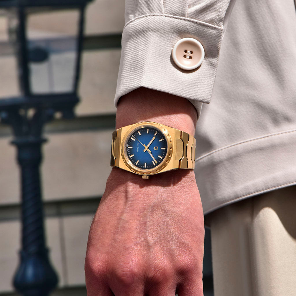 Das Armband der Pagani Design Adler Gold Blue ist sorgfältig aus hochwertigen Materialien gefertigt und kombiniert die Eleganz und Widerstandsfähigkeit von 316L Edelstahl. Es bietet unvergleichlichen Komfort und das einzigartige Gefühl, eine fast schwerelose Uhr am Handgelenk zu tragen.