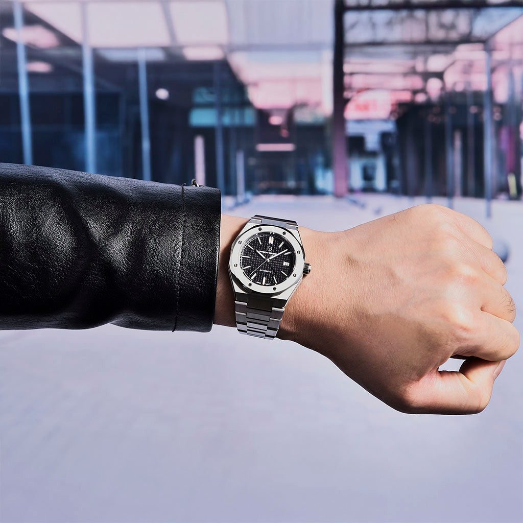 A pulseira do Pagani Design Altaris Nero é cuidadosamente projetada com materiais premium, combinando a resistência aço inoxidável 316L e a leveza do material. Proporciona um conforto incomparável e uma sensação única de estar usando um relógio quase imperceptível no pulso.