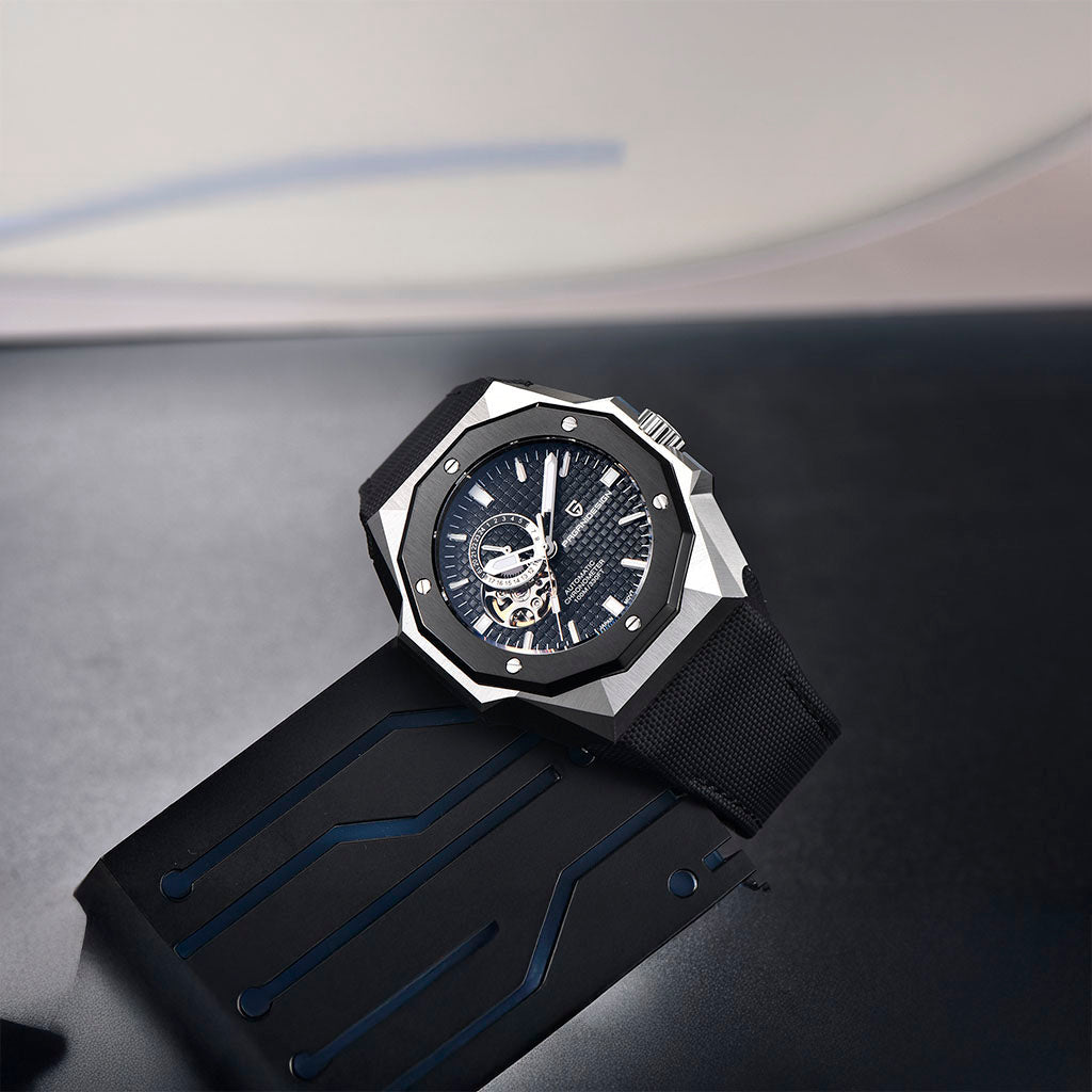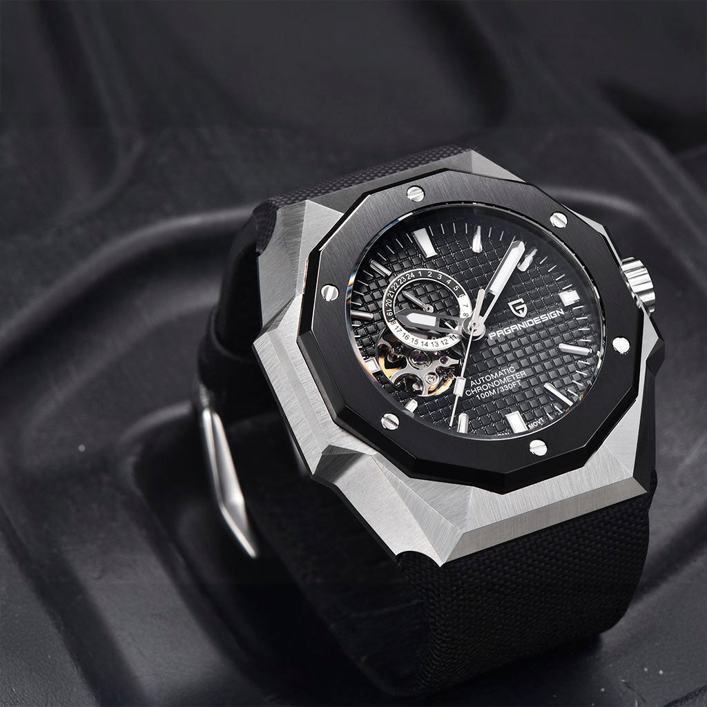 O movimento Seiko NH39 é uma versão aprimorada do Seiko NH39, conhecido por seu desempenho excepcional em termos de precisão e confiabilidade. O Pagani Design Armored Black equipado com o movimento NH39, possui uma impressionante reserva de marcha de aproximadamente 45 horas.