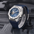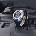 A pulseira do Pagani Design Armored Blue é cuidadosamente projetada com materiais premium, combinando a resistência e leveza do couro. Proporciona um conforto incomparável e uma sensação única de estar usando um relógio quase imperceptível no pulso.