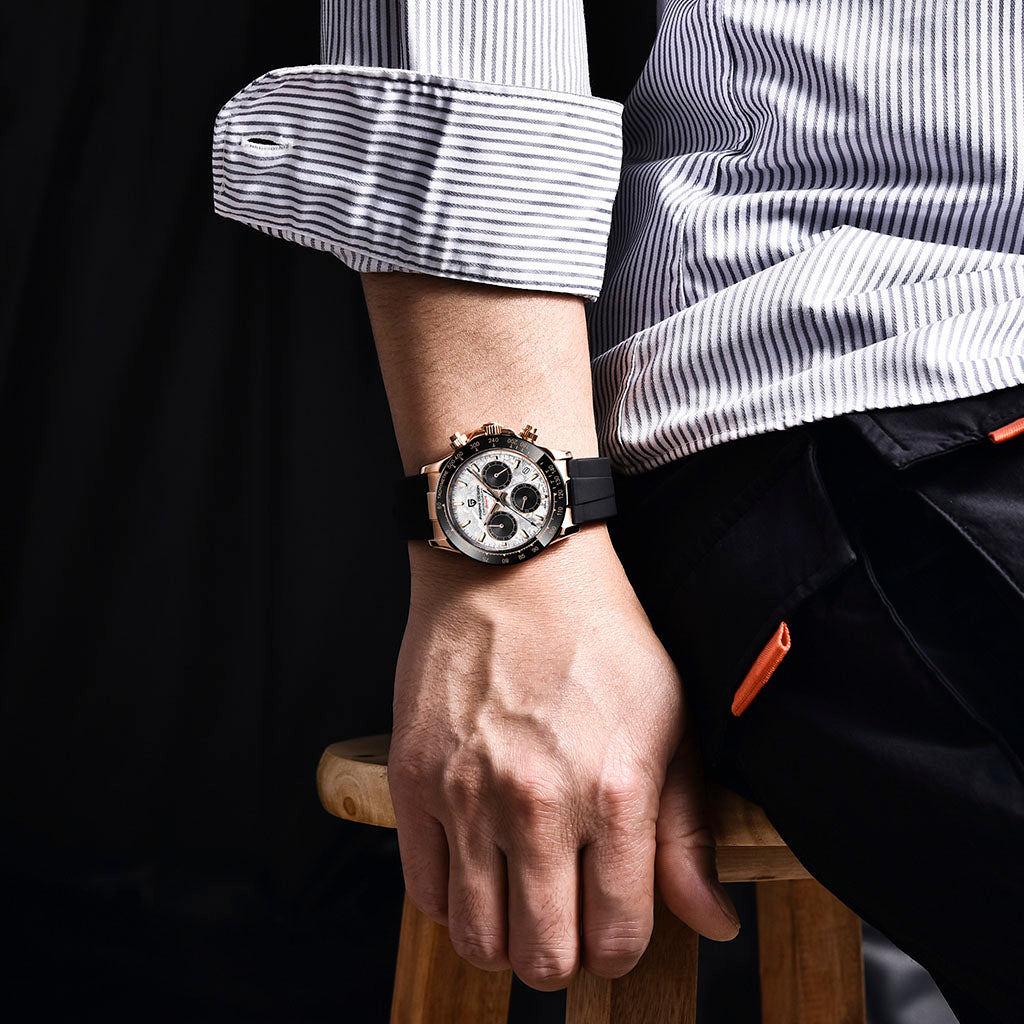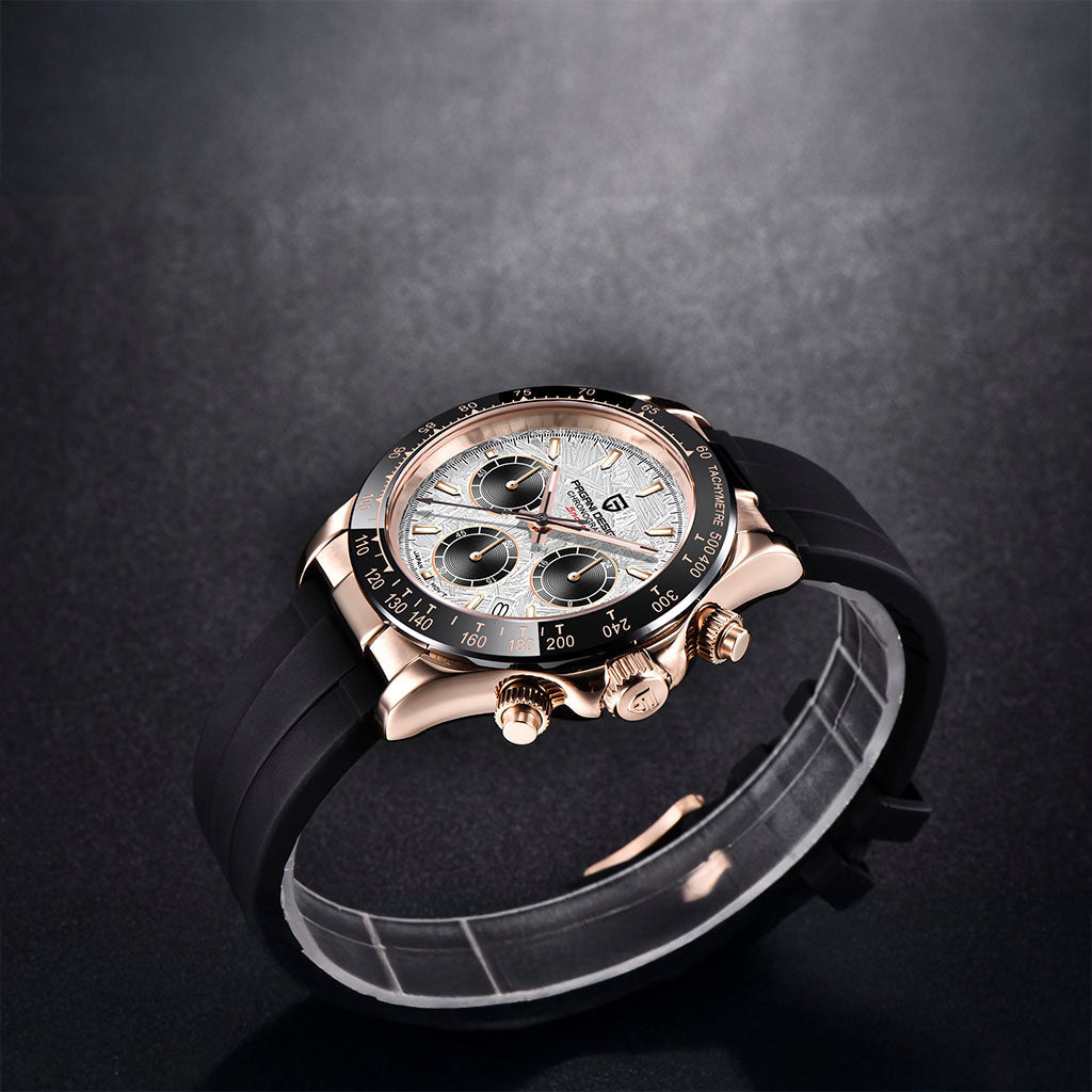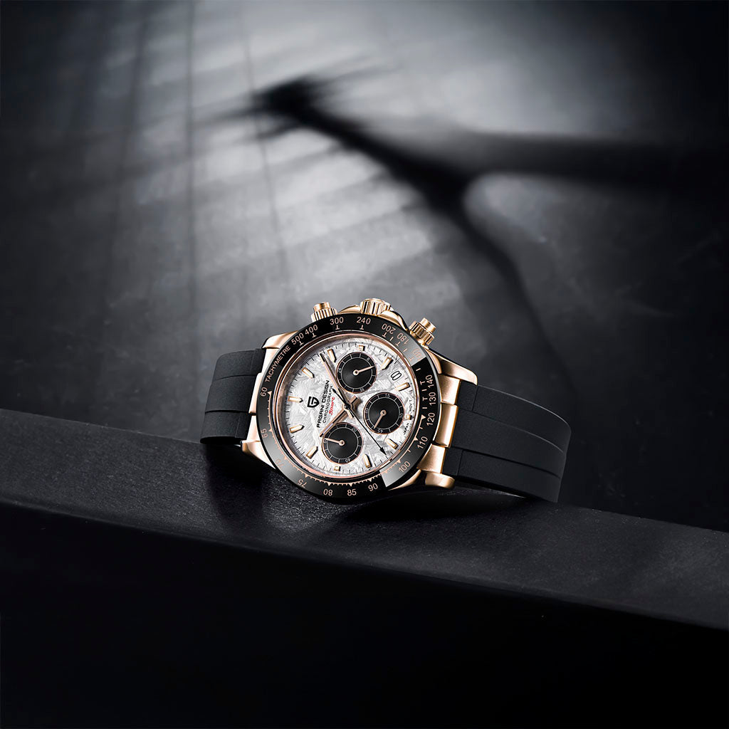 A pulseira do Pagani Design Barone Aeternum é projetada com materiais premium, com toda a resistência e leveza de borracha. Proporciona um conforto incomparável e uma sensação única de estar usando um relógio quase imperceptível no pulso.