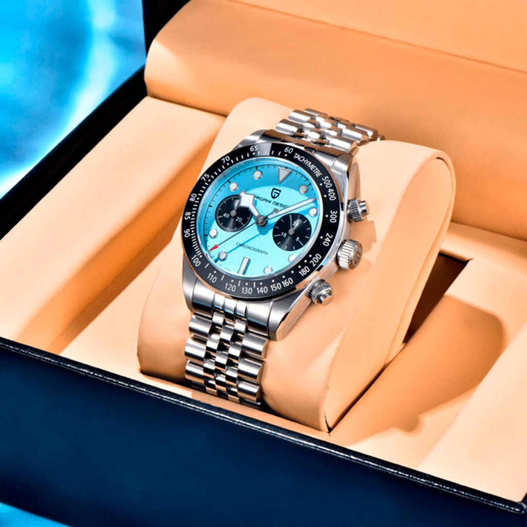 Erwerben Sie Ihre Pagani Design Dash Cyanite auf unserer Website und erhalten Sie unsere exklusive Verpackung. Diese Uhr ist die perfekte Wahl für alle, die Qualität und Raffinesse suchen. Investieren Sie in die Pagani Design Dash Cyanite und erleben Sie Exzellenz in jedem Detail.