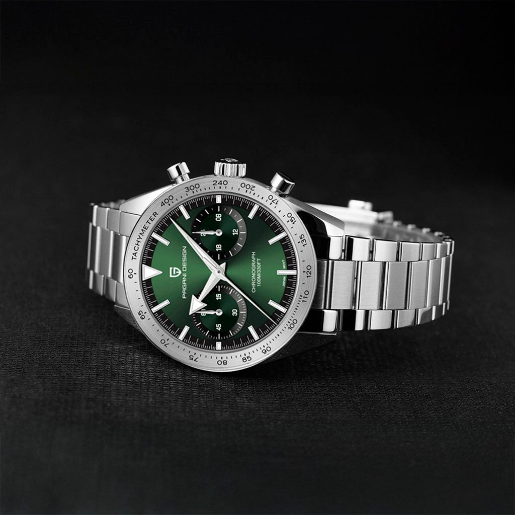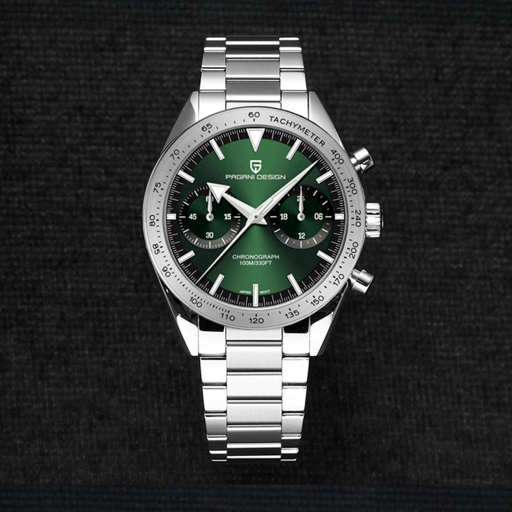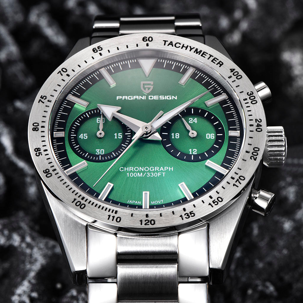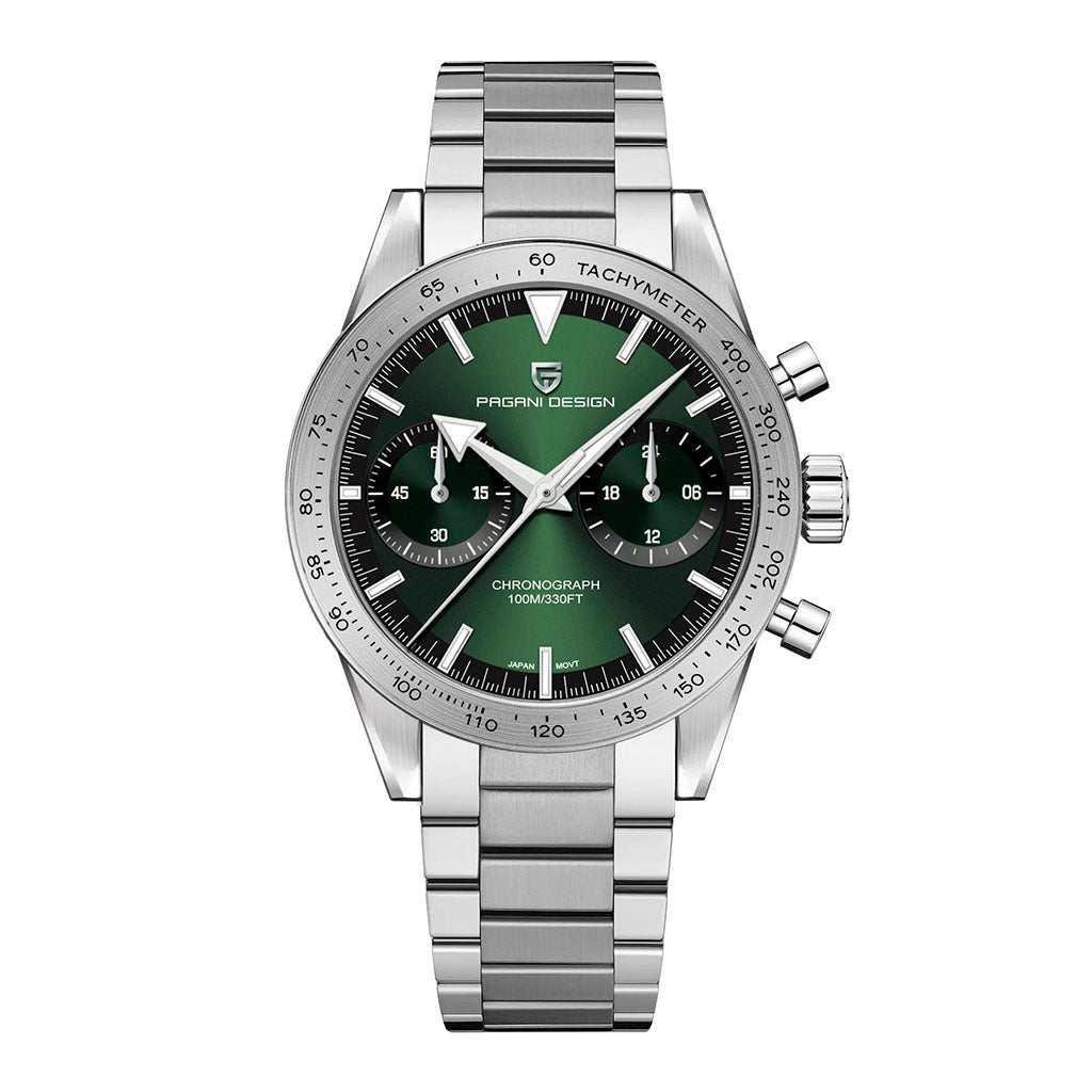 Das Seiko VK64-Werk ist bekannt für seine exzellente Präzision und Zuverlässigkeit. Die Pagani Design Drive Viridis, ausgestattet mit diesem Chronographenwerk, gewährleistet einen reibungslosen und präzisen Betrieb.