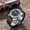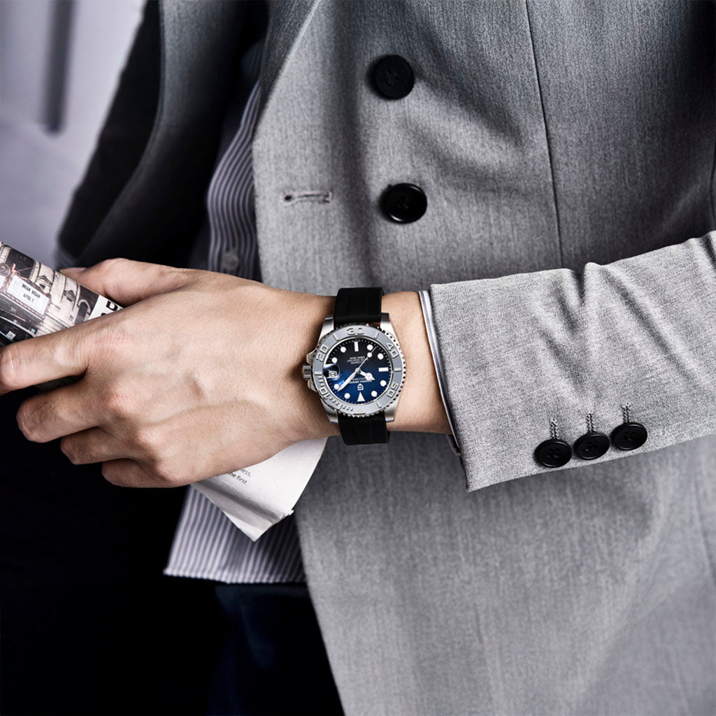 A pulseira do Pagani Design Explorer Blue and Gray Sport Edition é cuidadosamente projetada com borracha de alta qualidade, proporcionando resistência e leveza. Proporciona um conforto incomparável e uma sensação única de estar usando um relógio quase imperceptível no pulso.