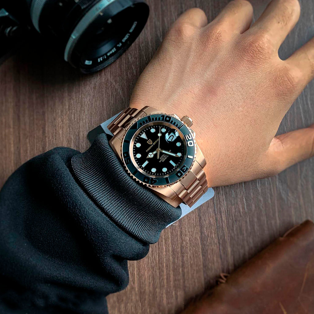 O relógio Pagani Design Explorer Pure Gold é resistente à água até 100 metros, proporcionando confiança e tranquilidade durante atividades aquáticas. A coroa do Pagani Design Explorer Pure Gold é rosqueada para garantir uma vedação completa e segura. Consulte o manual de uso e garantia para obter mais informações.