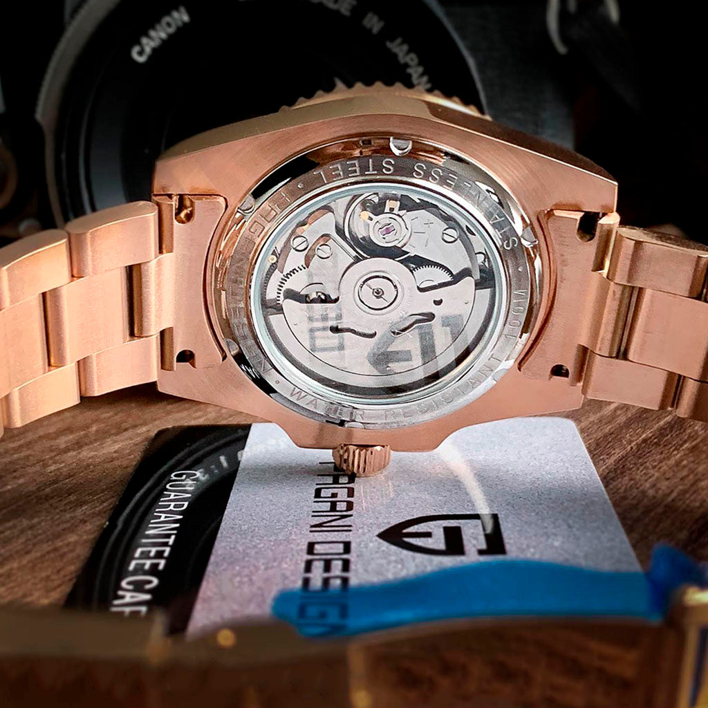 O movimento Seiko NH35A é uma versão aprimorada do Seiko NH25, conhecido por seu desempenho excepcional em termos de precisão e confiabilidade. O Pagani Design Explorer Pure Gold equipado com o movimento NH35A, possui uma impressionante reserva de marcha de aproximadamente 48 horas.