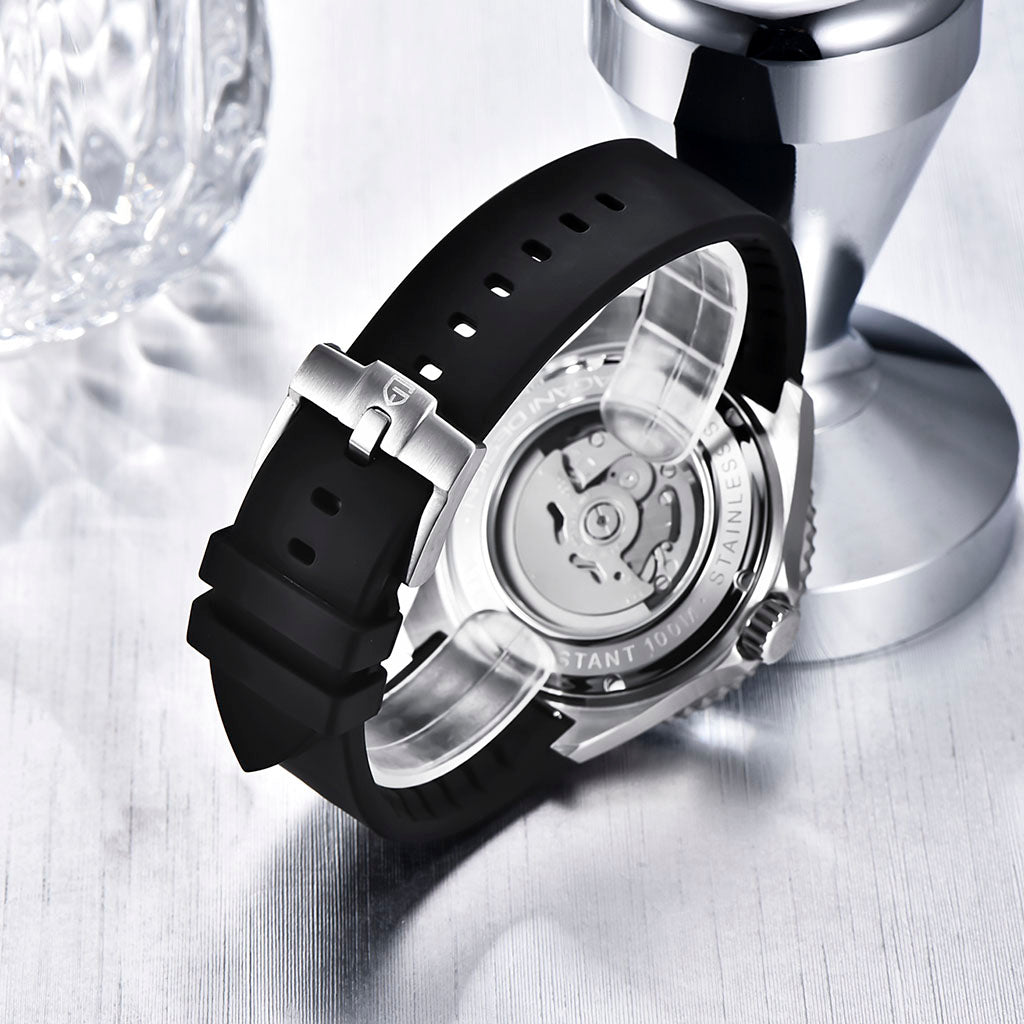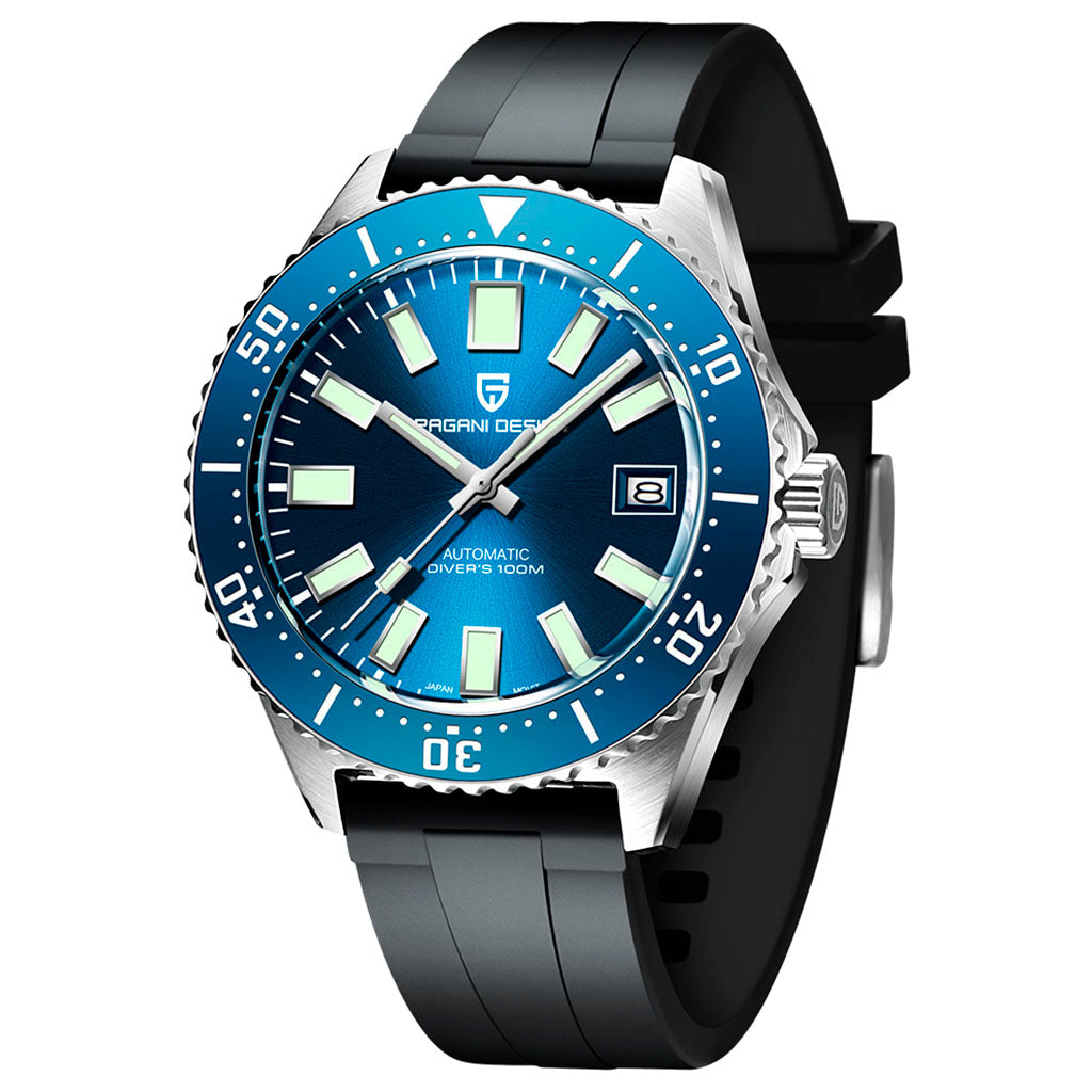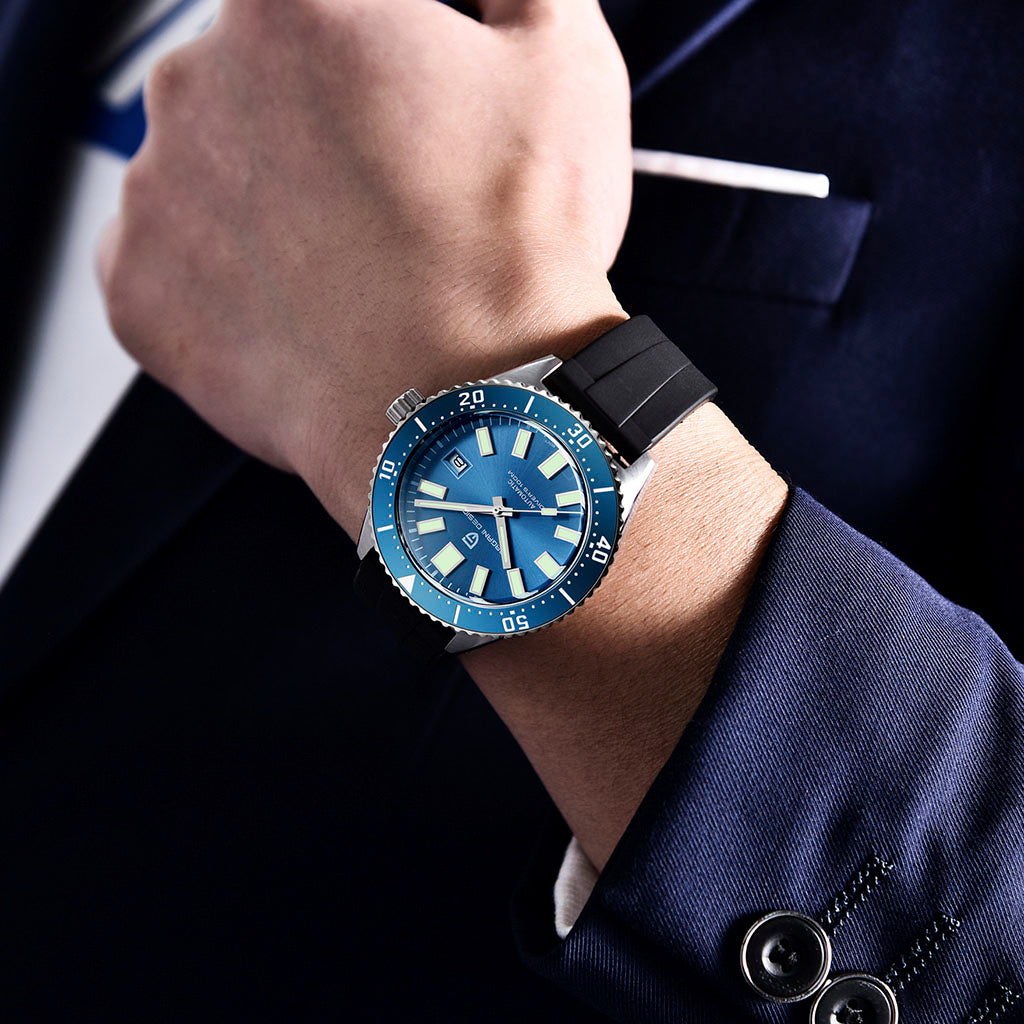 Das Armband des Pagani Design Falkenberg wurde mit höchster Sorgfalt aus edlen Materialien gefertigt und vereint die Widerstandsfähigkeit und Leichtigkeit von Kautschuk. Es bietet unvergleichlichen Tragekomfort und das exklusive Gefühl, eine Uhr zu tragen, die am Handgelenk kaum spürbar ist.
