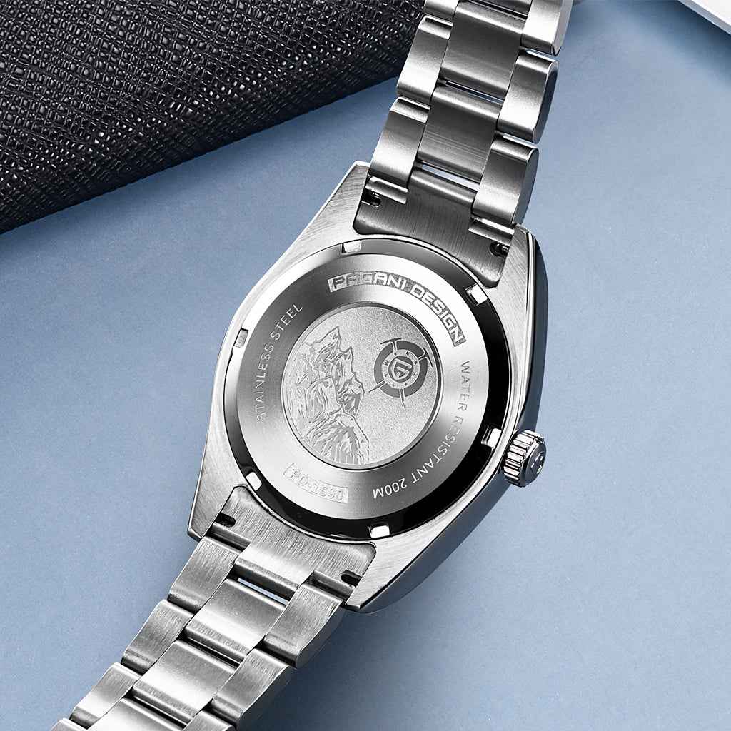 Die Uhr ist bis zu 200 Metern wasserdicht und bietet Vertrauen sowie Sicherheit bei Wasseraktivitäten. Die Krone der Pagani Design Firenze ist verschraubt, um eine vollständige und sichere Abdichtung zu gewährleisten. Bitte beachten Sie die Bedienungsanleitung und Garantieinformationen.