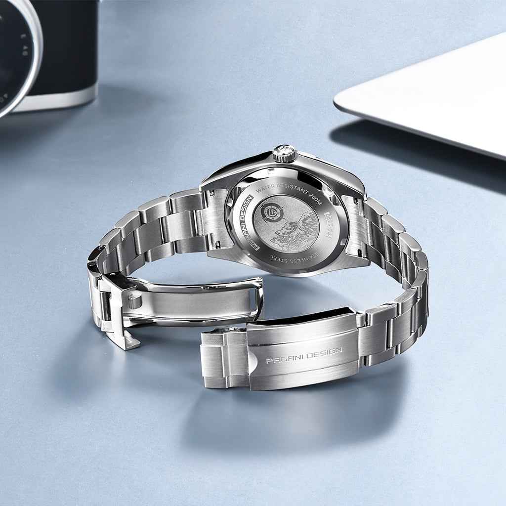 Das Armband der Pagani Design Firenze wurde sorgfältig aus 316L-Edelstahl gefertigt und vereint Robustheit mit Leichtigkeit. Es sorgt für unvergleichlichen Komfort und das einzigartige Gefühl, eine fast schwerelose Uhr am Handgelenk zu tragen.