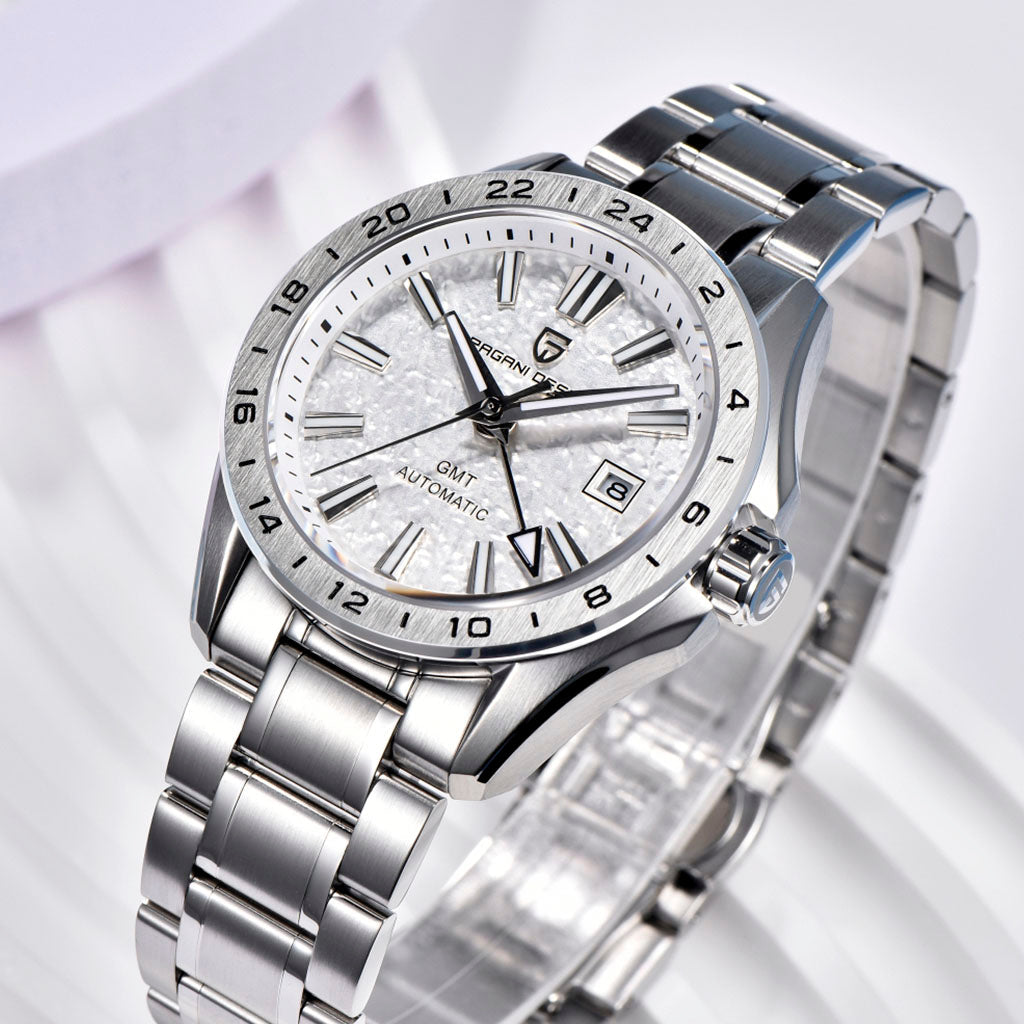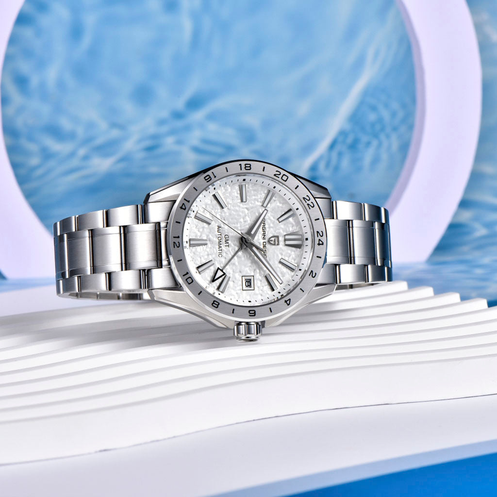 O relógio Pagani Design Fortress Silver é resistente à água até 100 metros, proporcionando confiança e tranquilidade durante atividades aquáticas. A coroa do Pagani Design Fortress Silver é rosqueada para garantir uma vedação completa e segura. Consulte o manual de uso e garantia para obter mais informações.