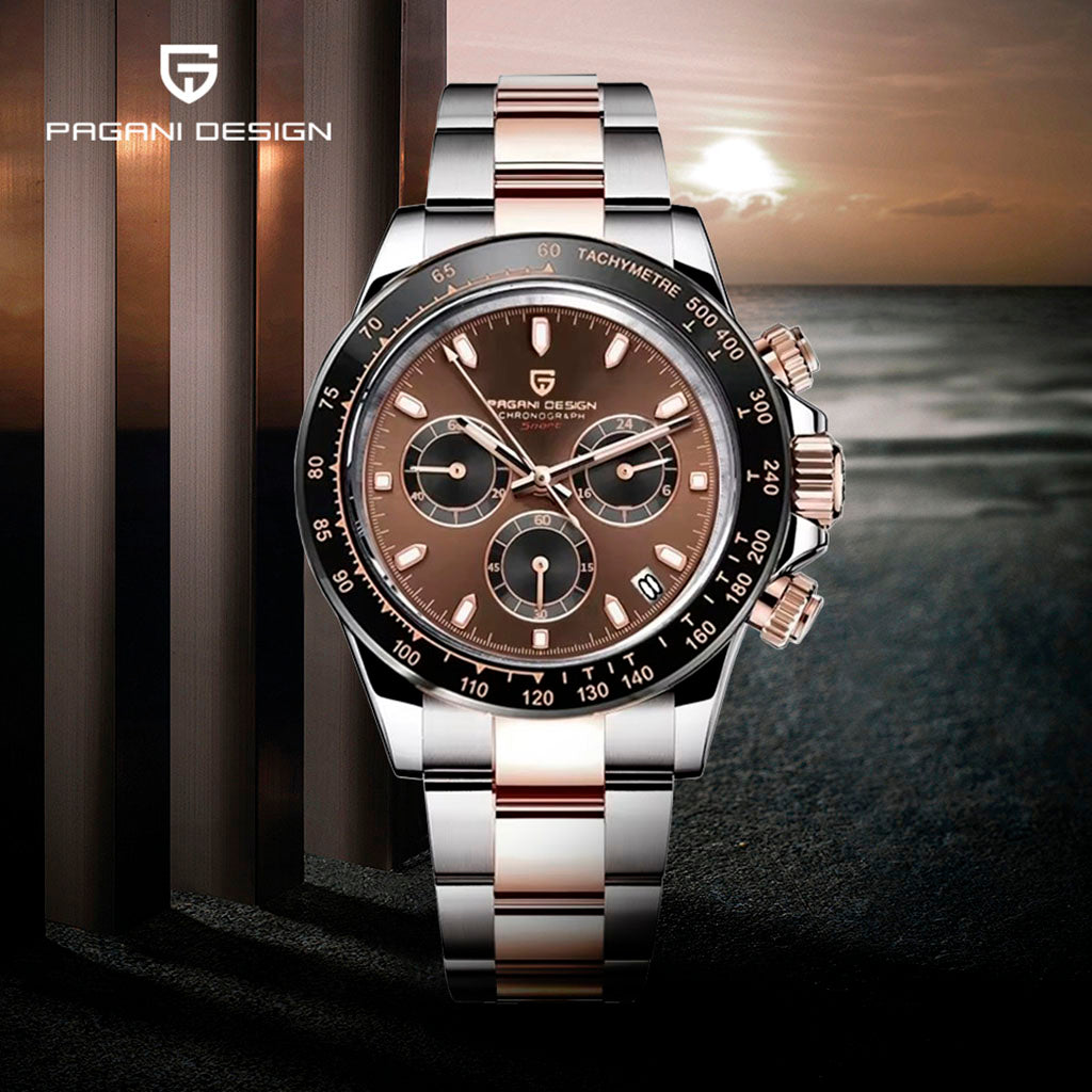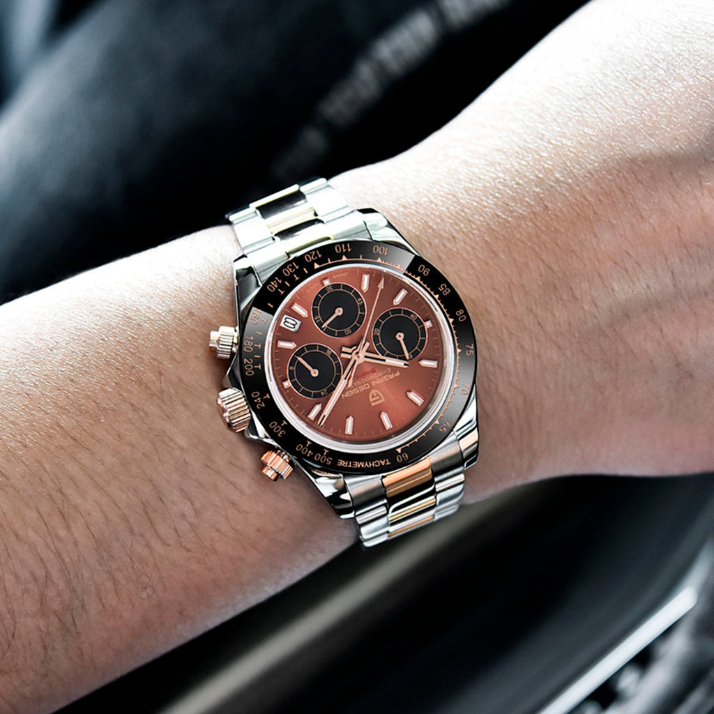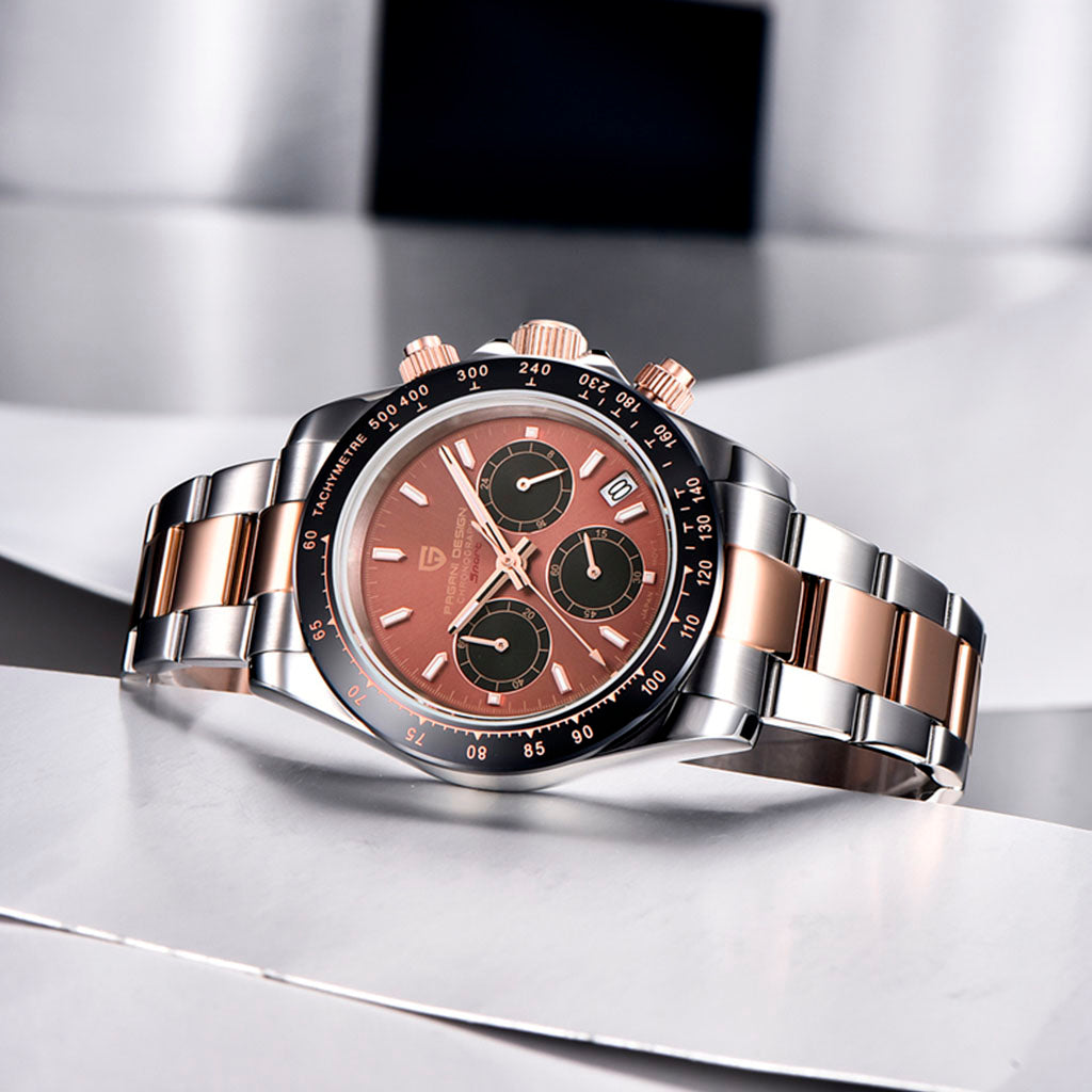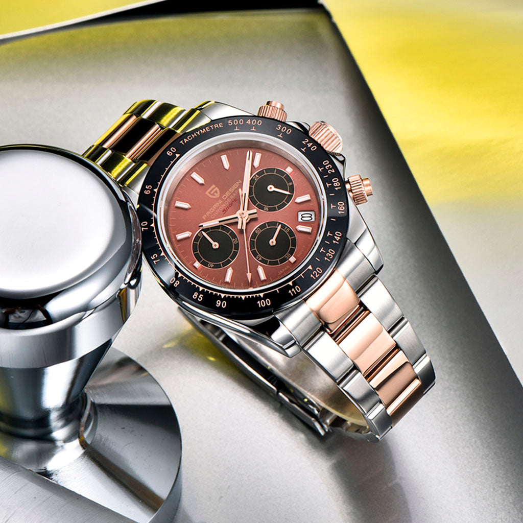 Das Seiko VK63-Uhrwerk ist bekannt für herausragende Präzision und Zuverlässigkeit. Der Pagani Design Glanzburg, ausgestattet mit dem Kaliber VK63, bietet eine geschmeidige und präzise Chronographenfunktion.