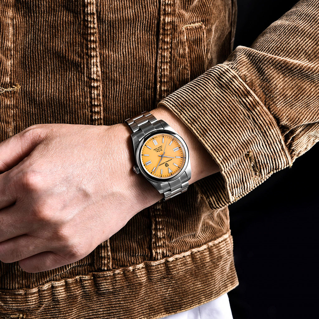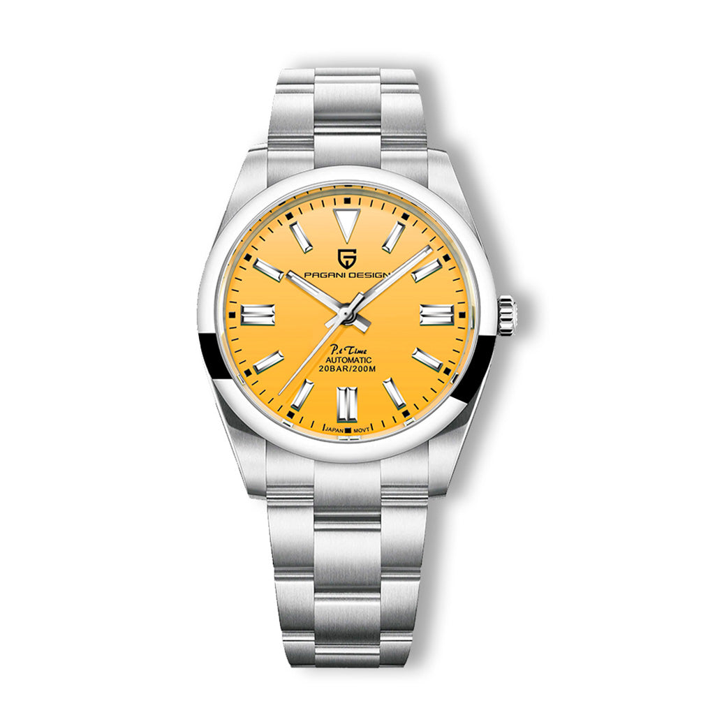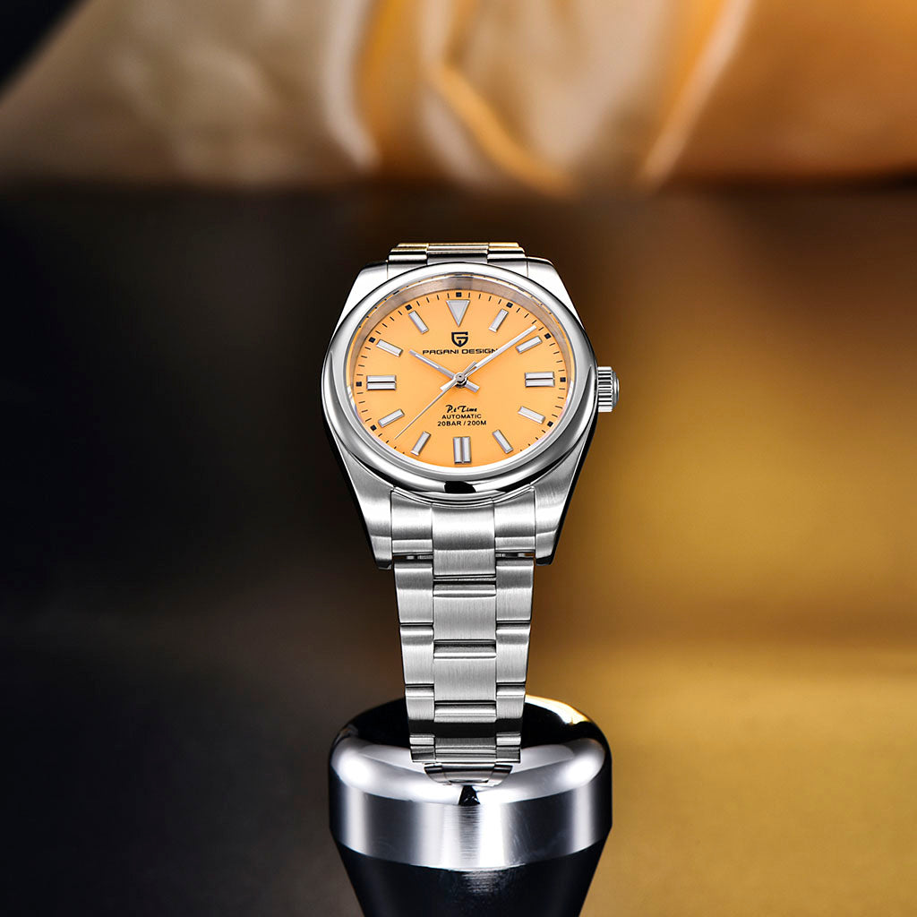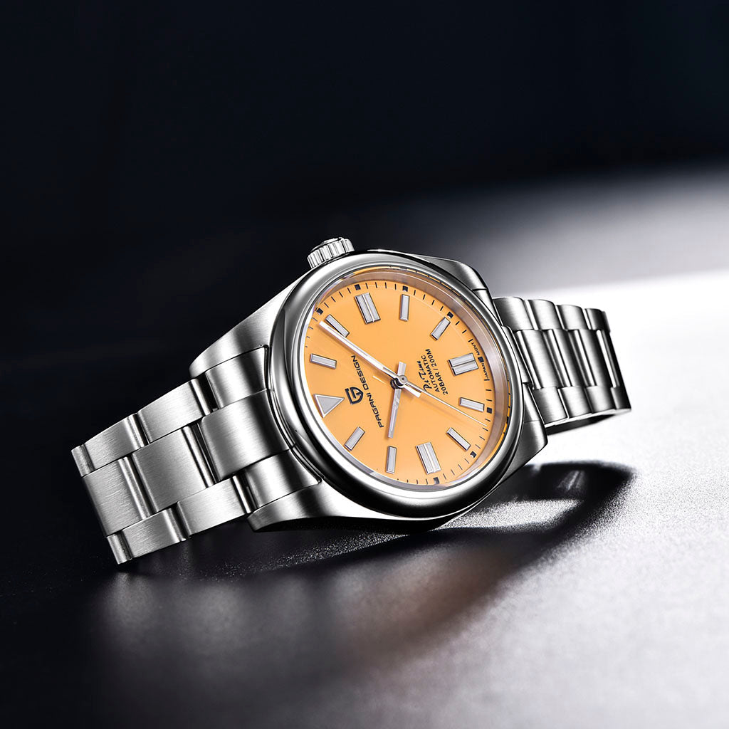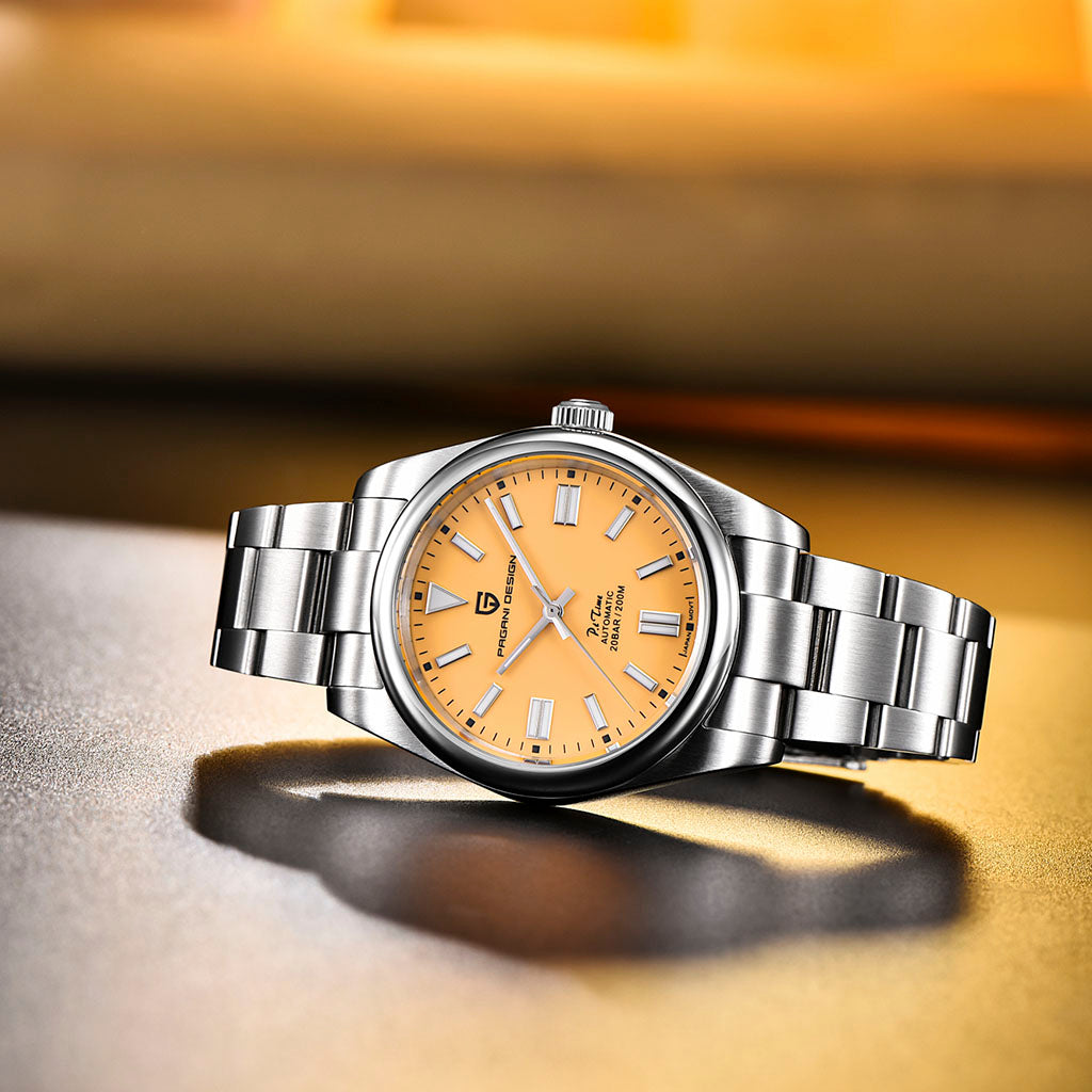 Das Seiko NH35A-Uhrwerk, eine verfeinerte Version des NH25A, ist bekannt für herausragende Präzision und Zuverlässigkeit. Im Pagani Design Goldstadt bietet es eine beeindruckende Gangreserve von rund 45 Stunden.