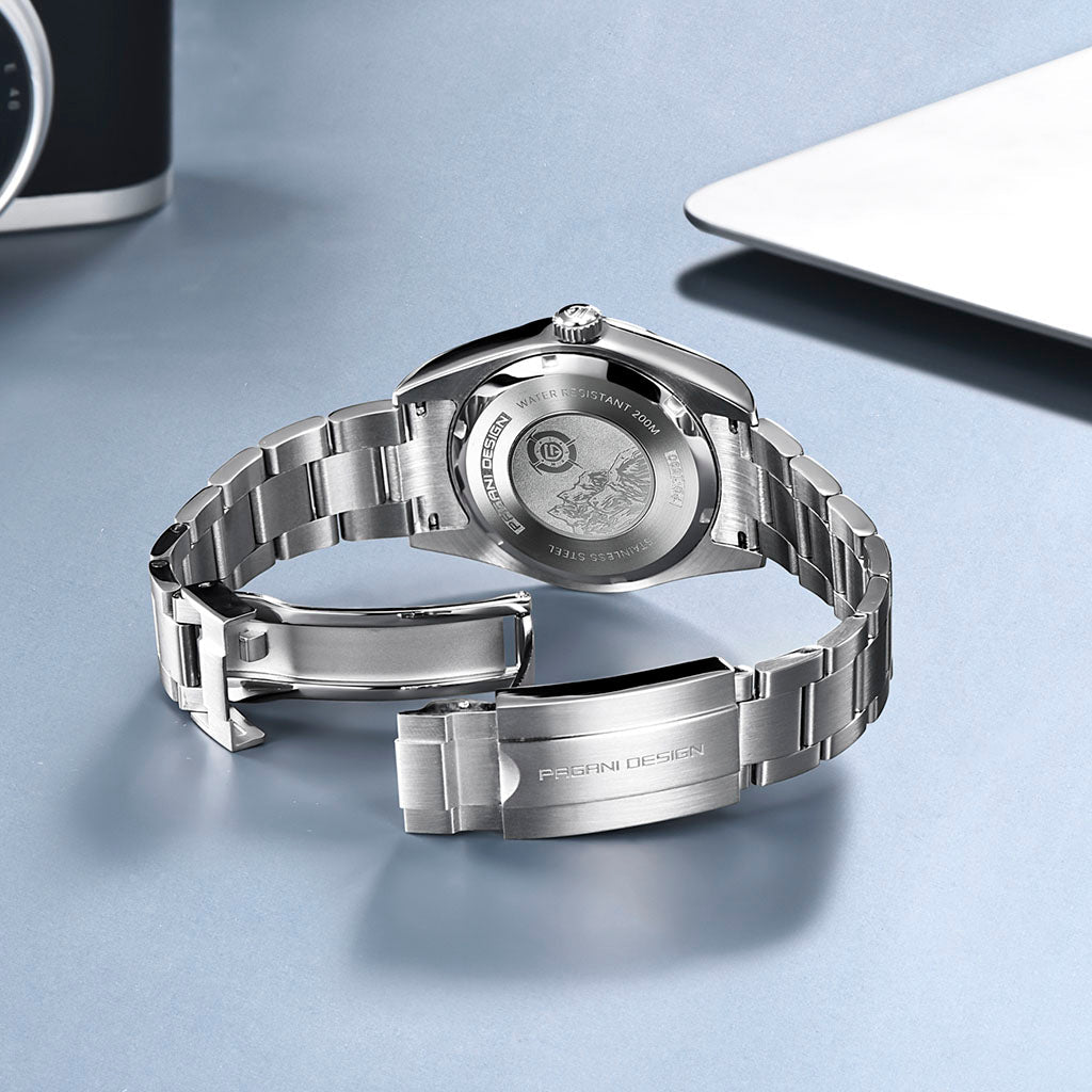 Das Armband des Pagani Design Goldstadt ist sorgfältig aus Edelstahl 316L gefertigt, das Stärke und Leichtigkeit harmonisch verbindet. Es bietet unvergleichlichen Tragekomfort und das Gefühl, eine Uhr zu tragen, die am Handgelenk kaum spürbar ist.