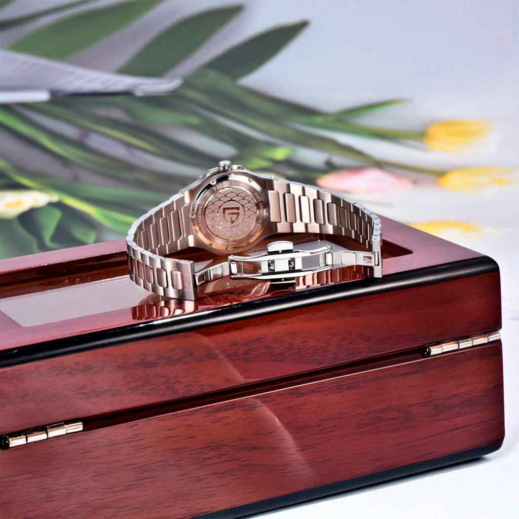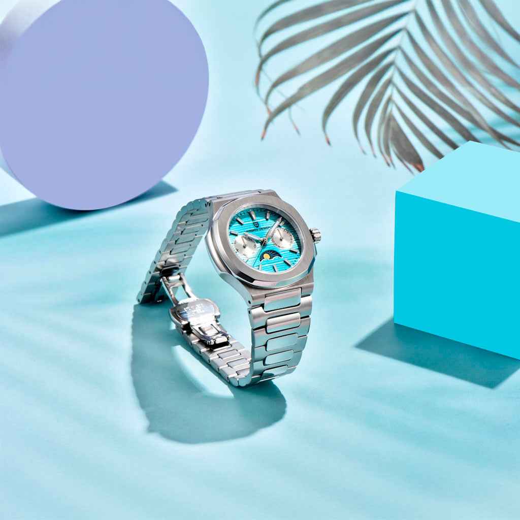 O relógio é resistente à água até 100 metros, proporcionando confiança e tranquilidade durante atividades aquáticas. A coroa do Pagani Design Magnus Blue é rosqueada para garantir uma vedação completa e segura. Consulte o manual de uso e garantia para obter mais informações.