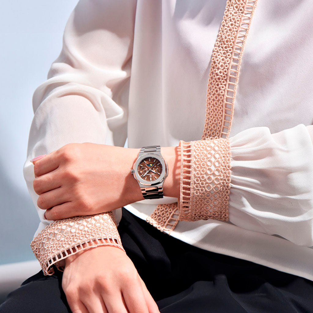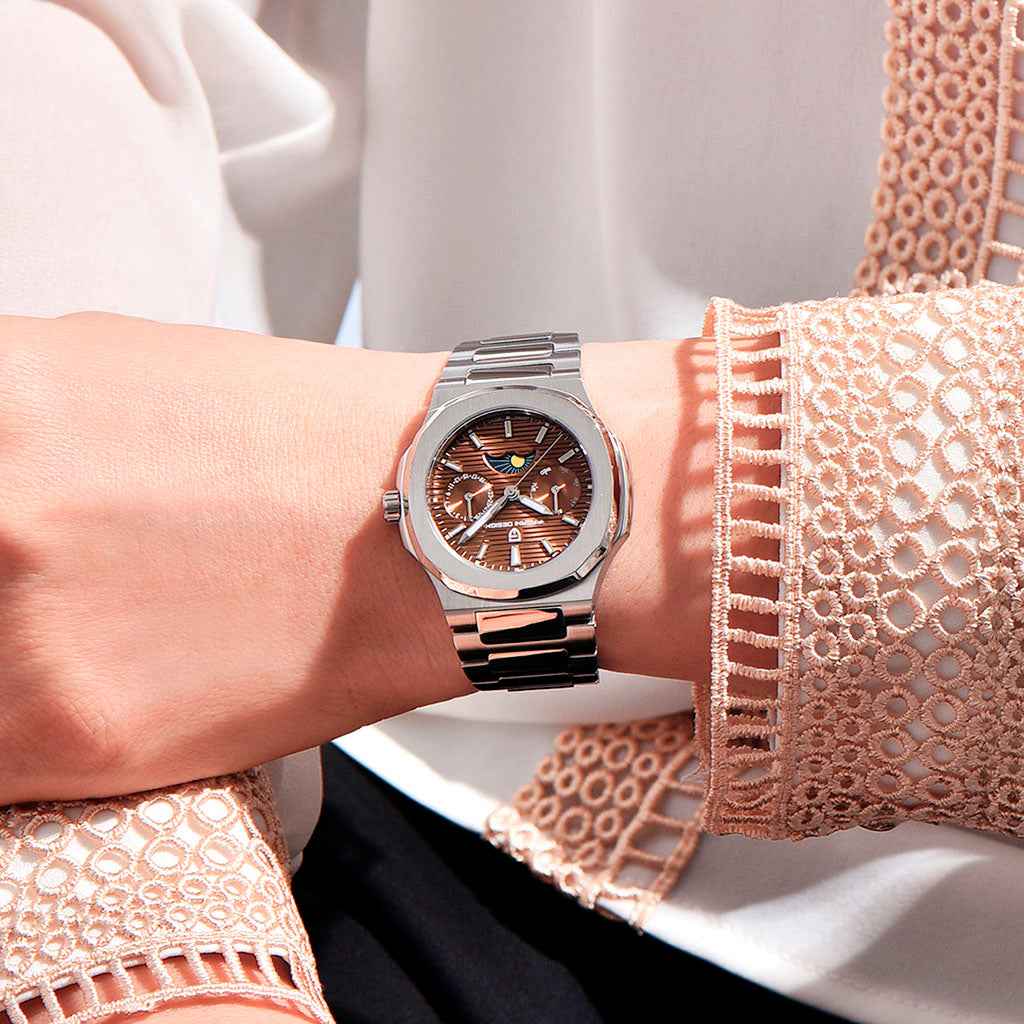 A pulseira do Pagani Design Magnus Brown é cuidadosamente projetada com materiais premium, combinando a resistência e leveza do aço inoxidável 316L. Proporciona um conforto incomparável e uma sensação única de estar usando um relógio quase imperceptível no pulso.