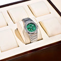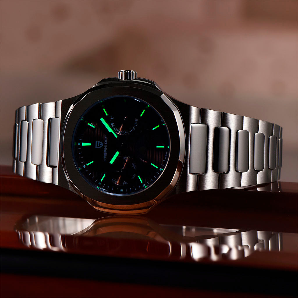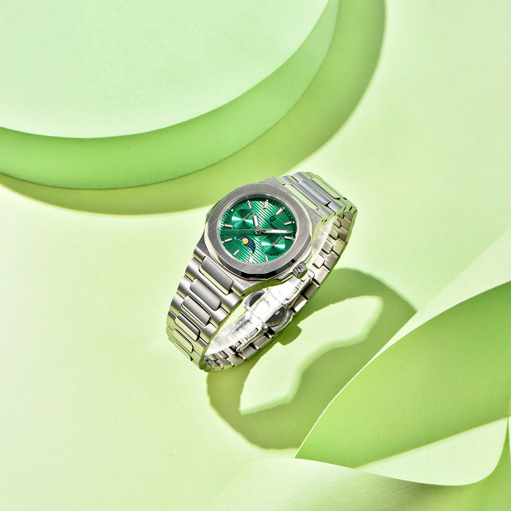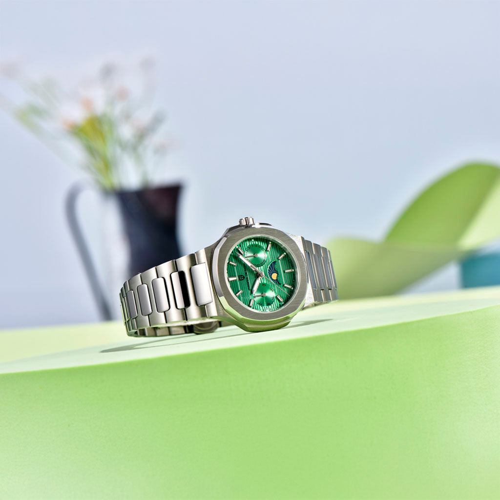 A pulseira do Pagani Design Magnus Green é cuidadosamente projetada com materiais premium, combinando a resistência e leveza do aço inoxidável 316L. Proporciona um conforto incomparável e uma sensação única de estar usando um relógio quase imperceptível no pulso.