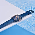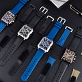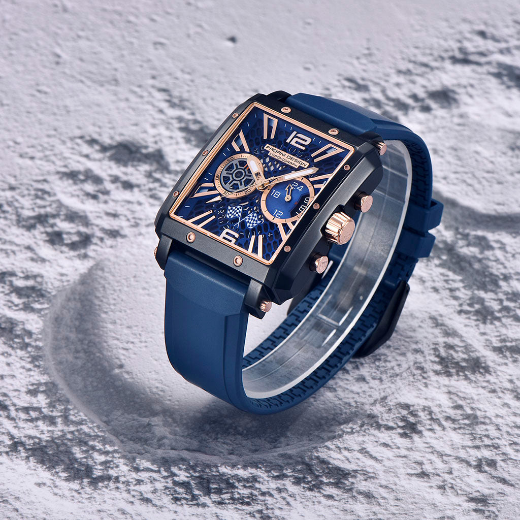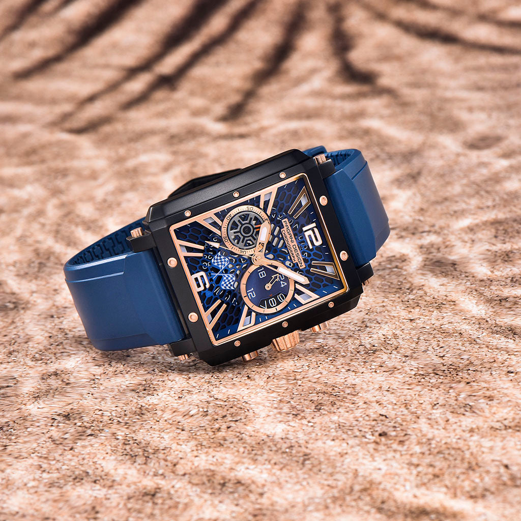 Das Armband der Pagani Design Monaco Aurum Noctis ist aus hochwertigem FKM gefertigt – einem Material, das Leichtigkeit und Widerstandsfähigkeit vereint. Es bietet unvergleichlichen Tragekomfort und vermittelt das Gefühl, eine fast schwerelose Uhr am Handgelenk zu tragen.