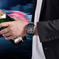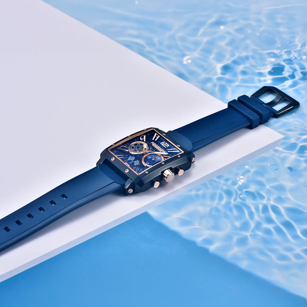 Die Pagani Design Monaco Aurum Noctis ist bis zu 100 Metern wasserdicht und bietet Sicherheit und Vertrauen bei allen Wasseraktivitäten. Die verschraubte Krone sorgt für eine vollständige und sichere Abdichtung. Weitere Informationen finden Sie im Benutzerhandbuch und in der Garantie.