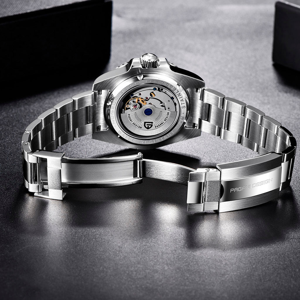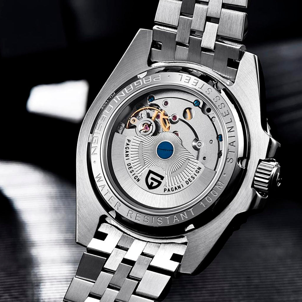 O relógio Pagani Design Nocturne Red and Black é resistente à água até 100 metros, proporcionando confiança e tranquilidade durante atividades aquáticas. A coroa do Pagani Design Nocturne Red and Black é rosqueada para garantir uma vedação completa e segura. Consulte o manual de uso e garantia para obter mais informações.