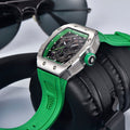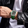 A pulseira do Pagani Design Nurburg Green é cuidadosamente projetada com materiais premium, com toda a resistência e leveza do FKM. Proporciona um conforto incomparável e uma sensação única de estar usando um relógio quase imperceptível no pulso.