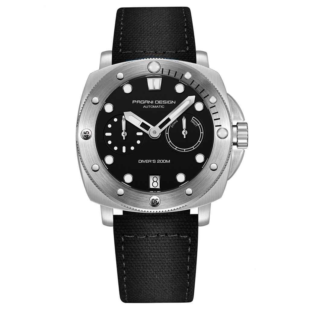 Die Pagani Design Nürburg Noctis Black ist bis 200 Meter wasserdicht und bietet Sicherheit und Vertrauen bei allen Wasseraktivitäten. Die verschraubte Krone gewährleistet eine vollständige und sichere Abdichtung.