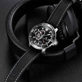 Das Armband der Oblivion Noir ist aus hochwertigen Materialien gefertigt, die die Robustheit von Nylon mit der Leichtigkeit von Silikon kombinieren. Es bietet unvergleichlichen Tragekomfort und vermittelt das Gefühl, eine nahezu schwerelose Uhr zu tragen.