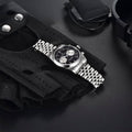 A pulseira do Pagani Design Pilot Black é cuidadosamente projetada com materiais premium, combinando a resistência e leveza do aço inoxidável 316L. Proporciona um conforto incomparável e uma sensação única de estar usando um relógio quase imperceptível no pulso.