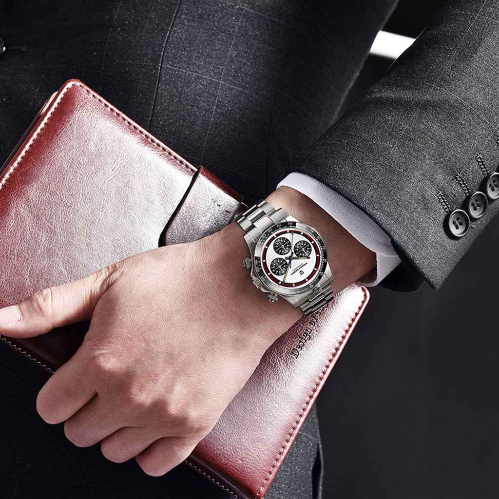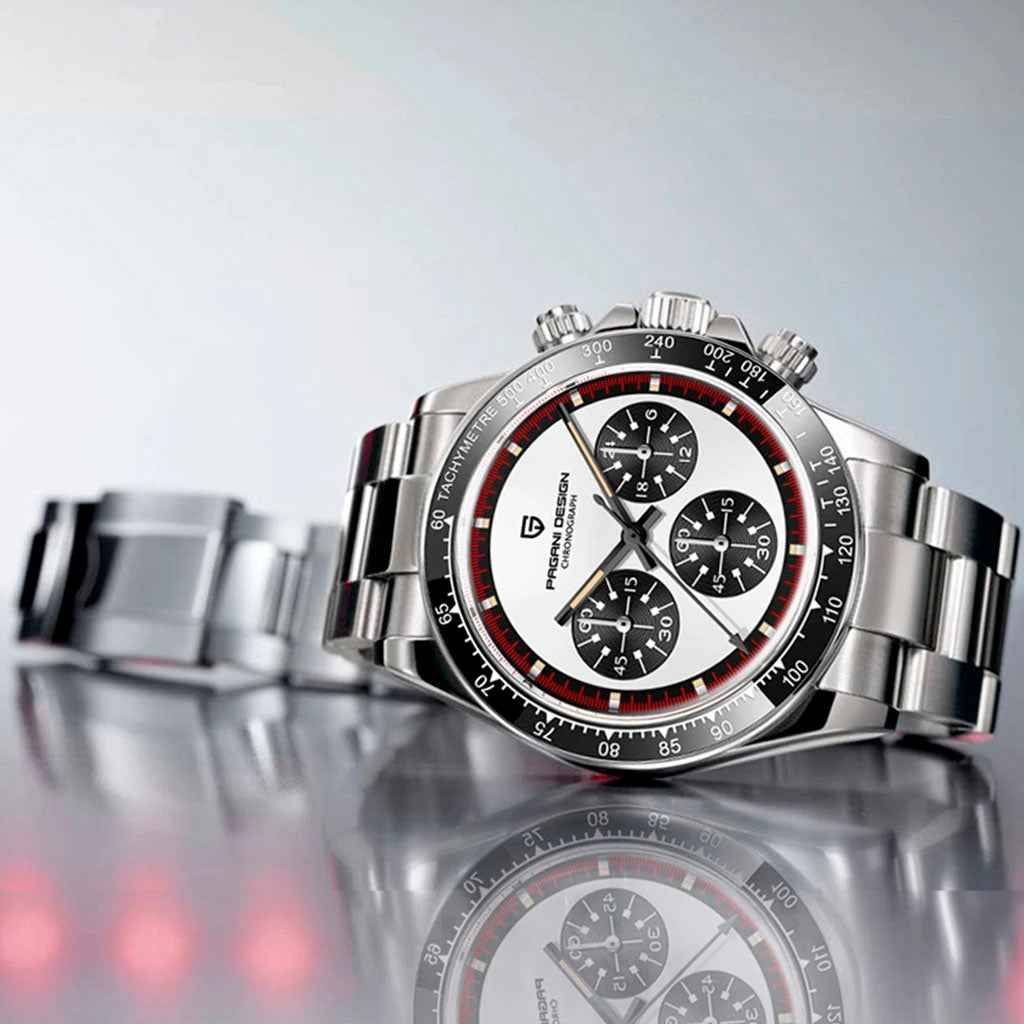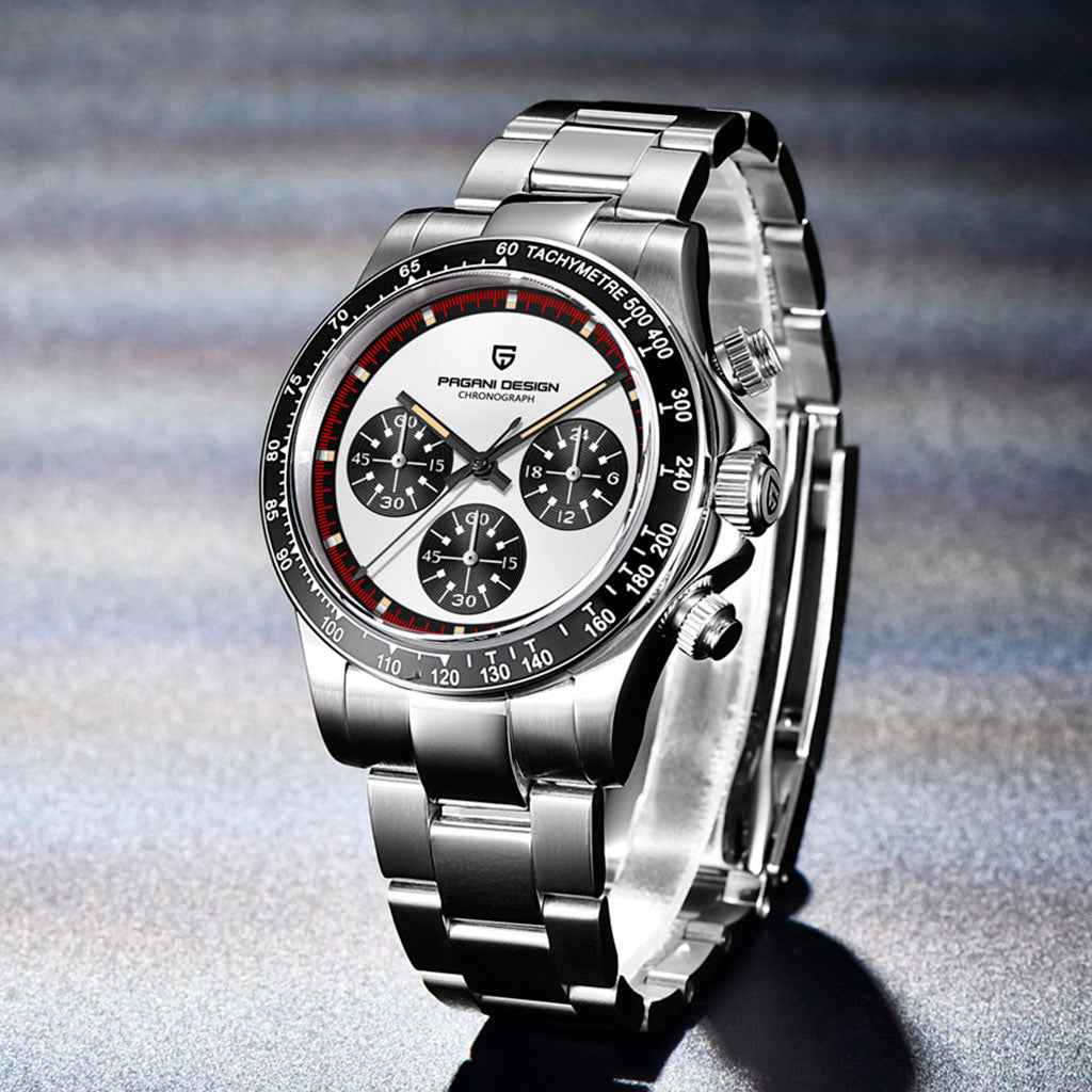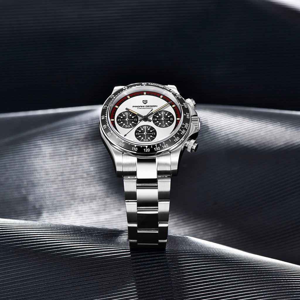 Das Seiko VK63 Quarzwerk ist für Präzision und Zuverlässigkeit bekannt. Die Pagani Design Rennes Noir, ausgestattet mit diesem Werk, garantiert eine flüssige und präzise Chronographenfunktion