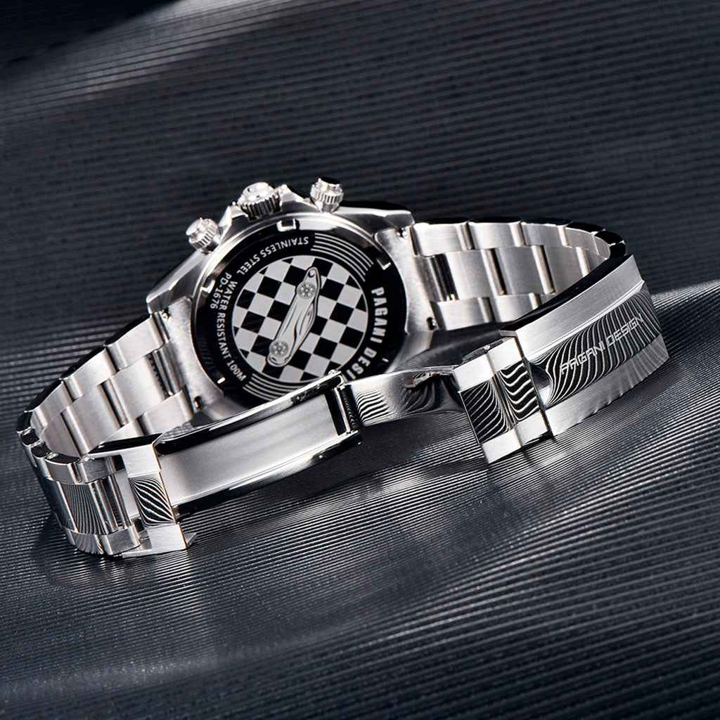 Das Armband der Pagani Design Rennes Noir wird aus hochwertigem 316L-Edelstahl gefertigt und verbindet Leichtigkeit mit Robustheit. Es vermittelt ein unvergleichliches Tragegefühl, kaum spürbar am Handgelenk.