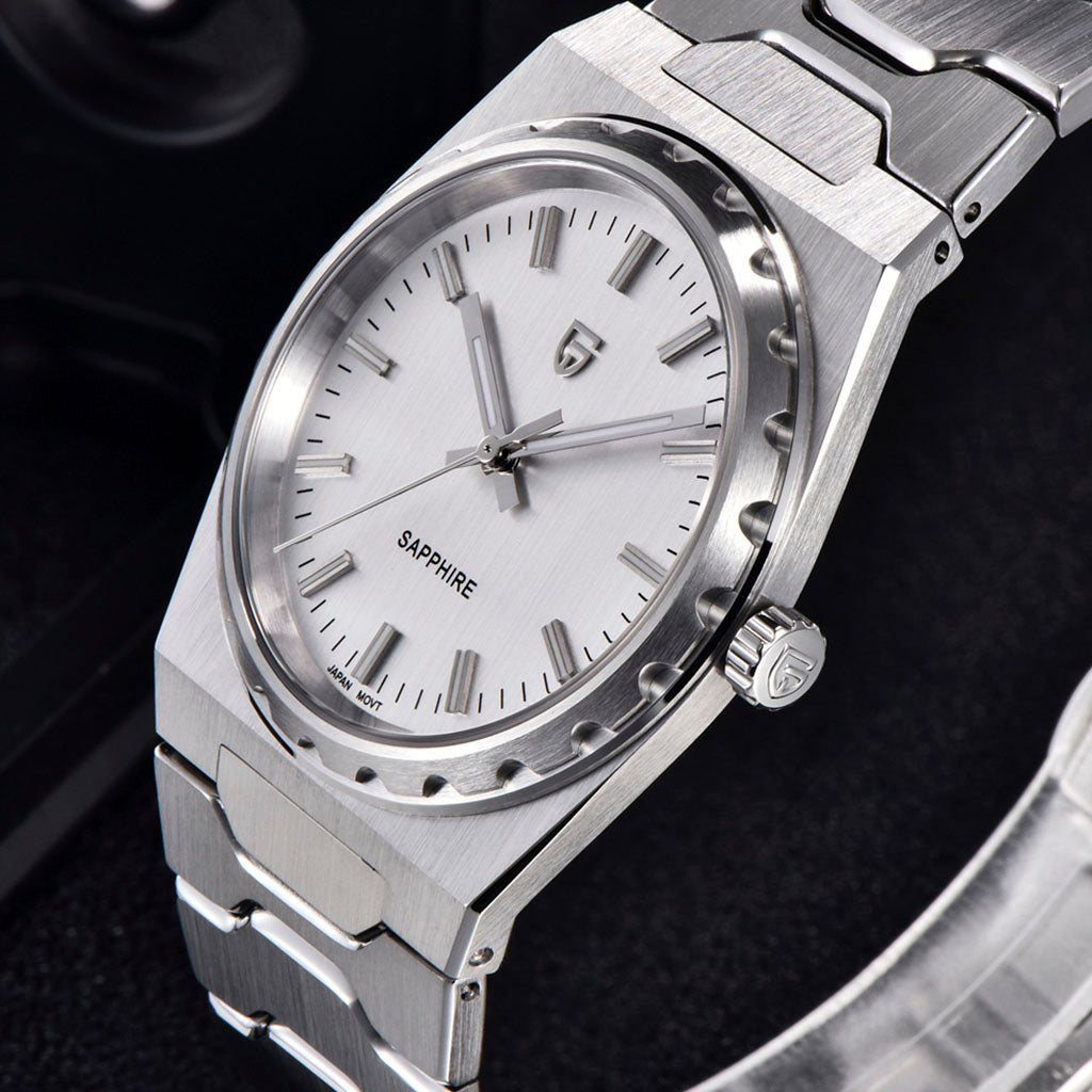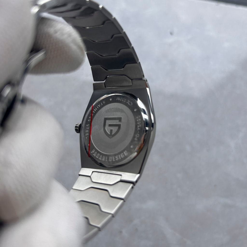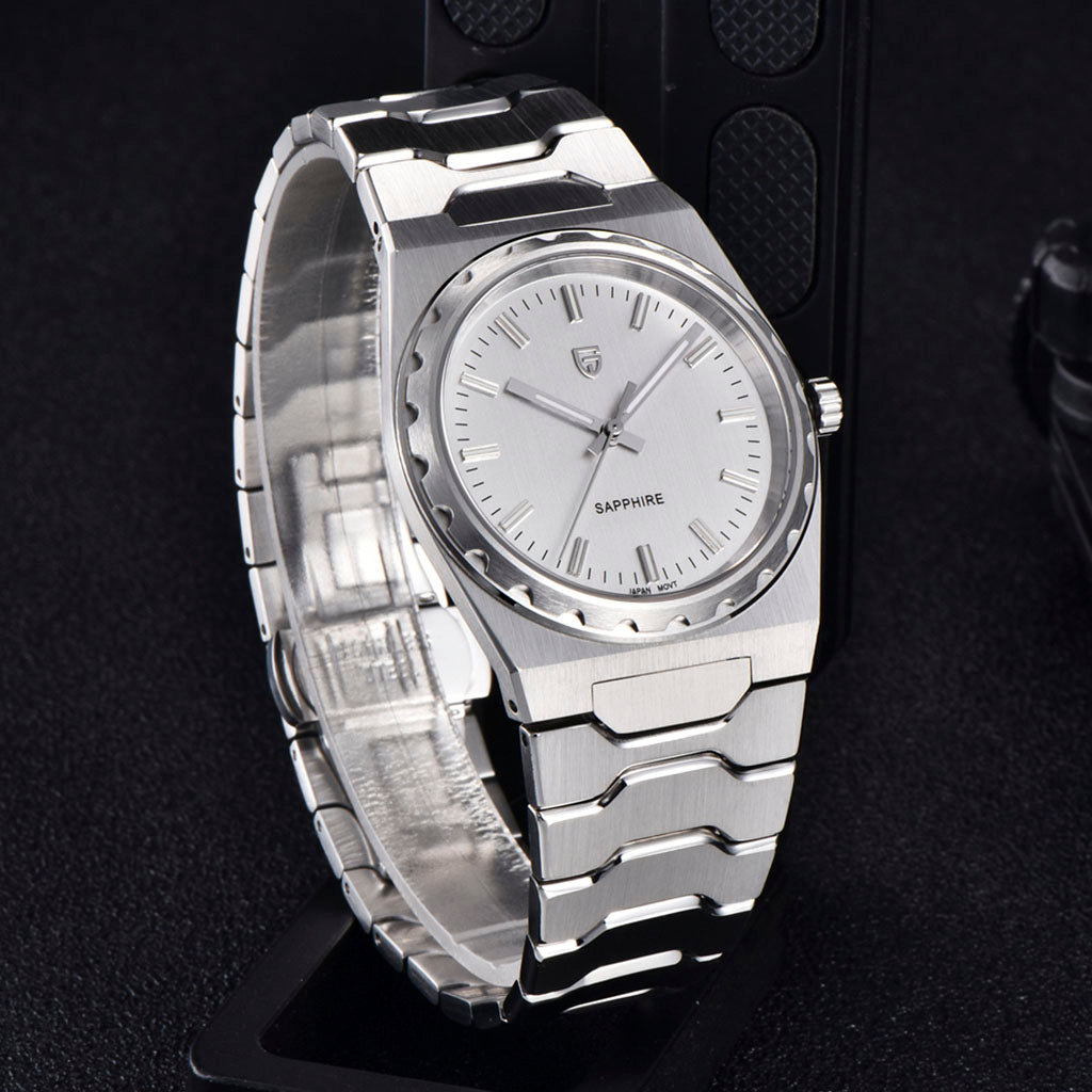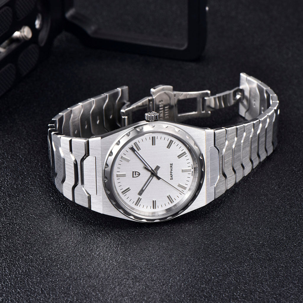 Das Armband der Pagani Design Sonnenberg Silver White ist sorgfältig aus hochwertigem 316L-Edelstahl gefertigt und vereint Eleganz mit Widerstandskraft. Es sorgt für unvergleichlichen Komfort und das Gefühl, fast keine Uhr am Handgelenk zu tragen.