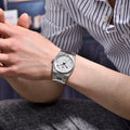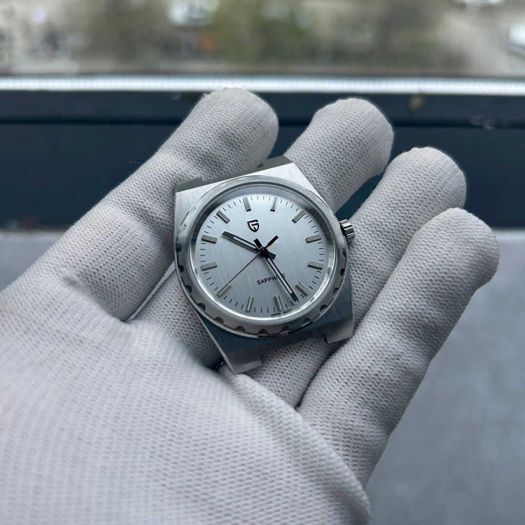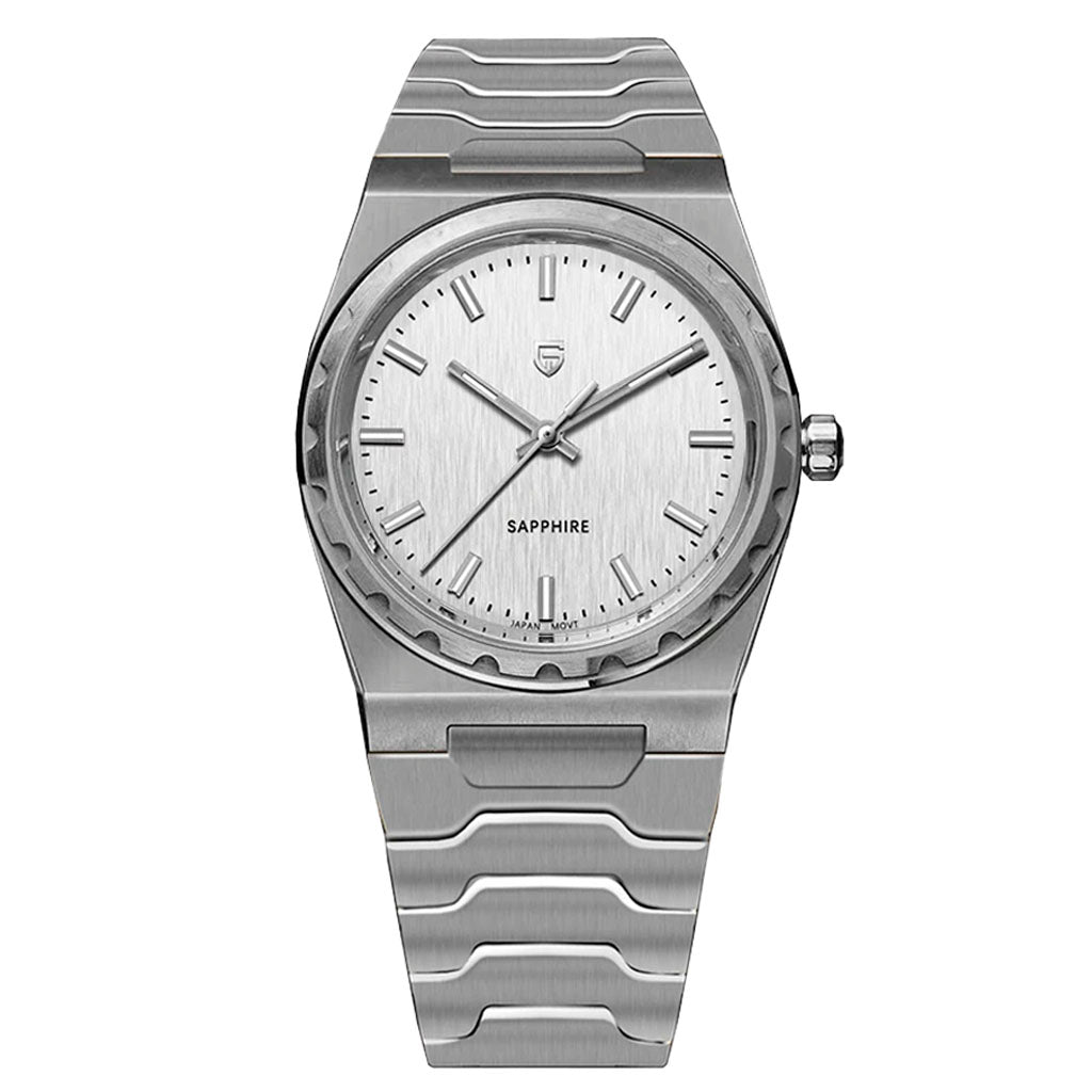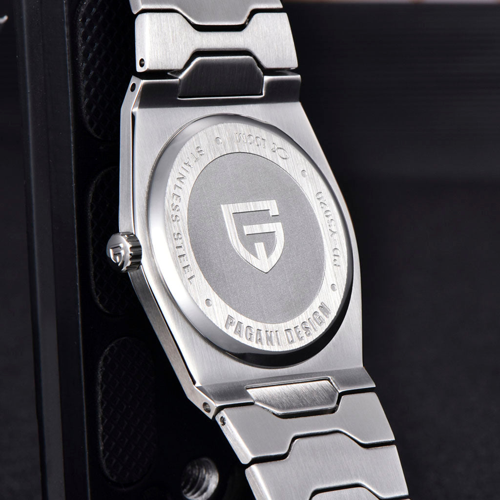 Das Armband der Pagani Design Sonnenberg Silver White ist sorgfältig aus hochwertigem 316L-Edelstahl gefertigt und vereint Eleganz mit Widerstandskraft. Es sorgt für unvergleichlichen Komfort und das Gefühl, fast keine Uhr am Handgelenk zu tragen.