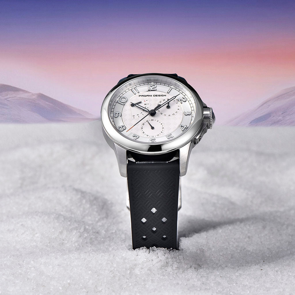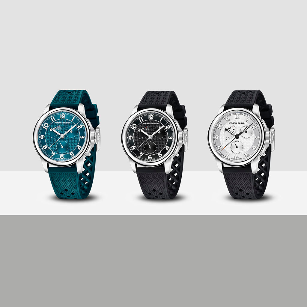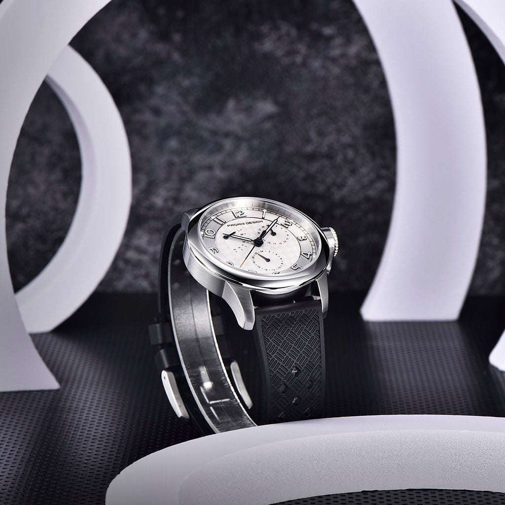 Das Armband der Pagani Design Sovereign Noir ist mit höchster Präzision aus Premium-Materialien gefertigt und kombiniert die Widerstandsfähigkeit mit der Leichtigkeit von Kautschuk. Es bietet unvergleichlichen Tragekomfort und vermittelt das Gefühl, nahezu schwerelos eine Uhr zu tragen.