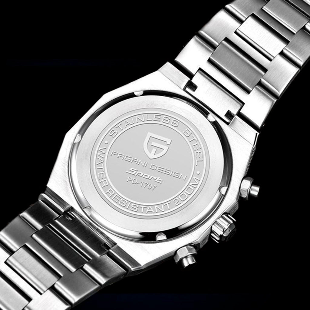 Die Pagani Design Track Azura wird aus hypoallergenem Edelstahl 316L gefertigt, der für seine hohe Korrosionsbeständigkeit, seinen luxuriösen Glanz und seine bemerkenswerte Langlebigkeit steht.