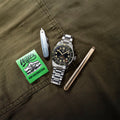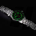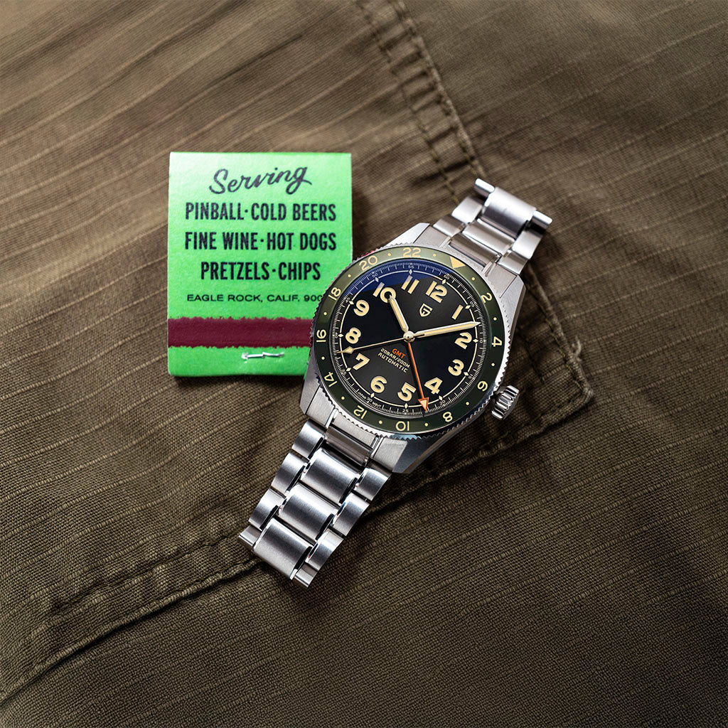 A pulseira do Pagani Design Trailblazer Green é cuidadosamente projetada com aço inoxidável 316L, combinando a resistência do aço e a leveza do material. Proporciona um conforto incomparável e uma sensação única de estar usando um relógio quase imperceptível no pulso.