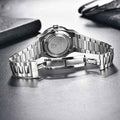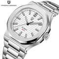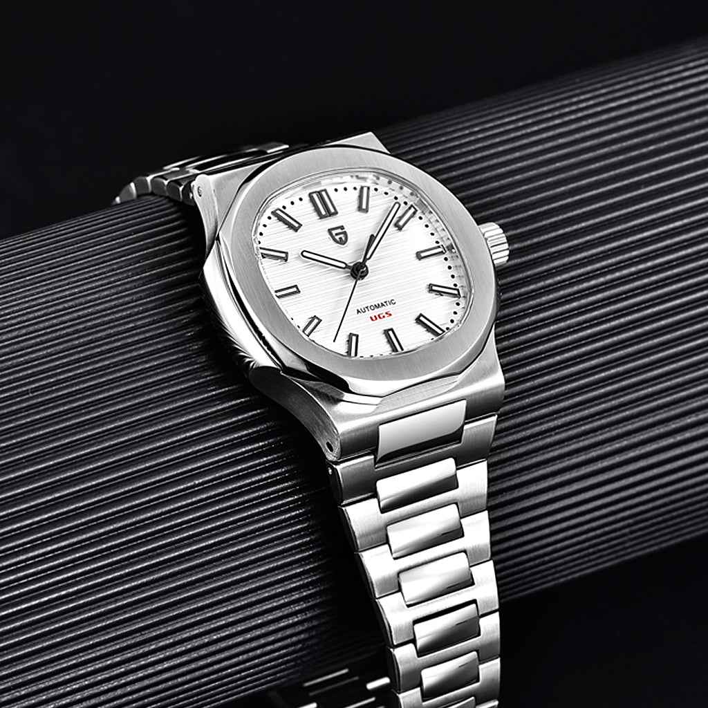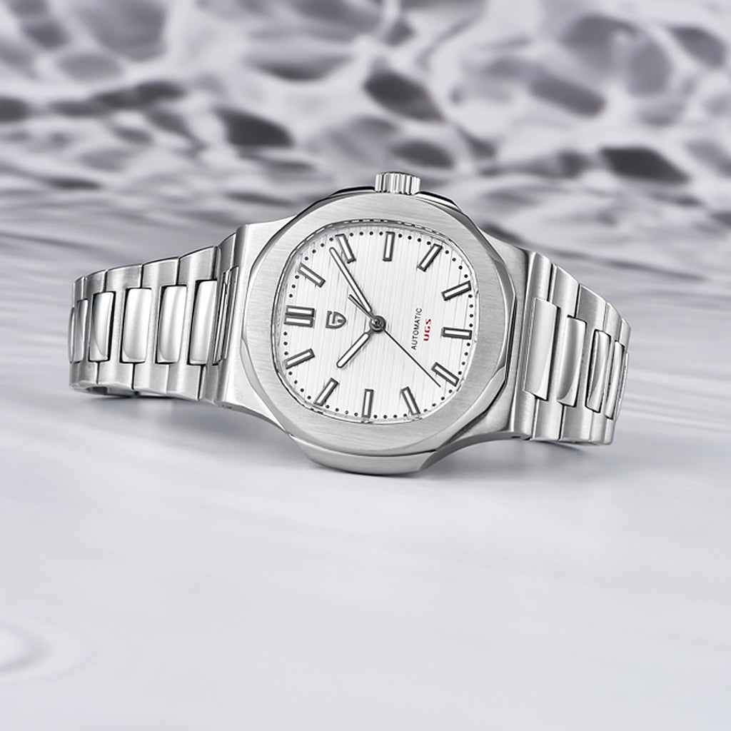 Die Uhr ist bis zu 100 Metern wasserdicht und bietet Sicherheit und Vertrauen bei Wasseraktivitäten. Die Krone der Pagani Design Vanguard ist verschraubt, um eine vollständige und sichere Abdichtung zu gewährleisten. Bitte beachten Sie die Bedienungsanleitung und Garantieinformationen.