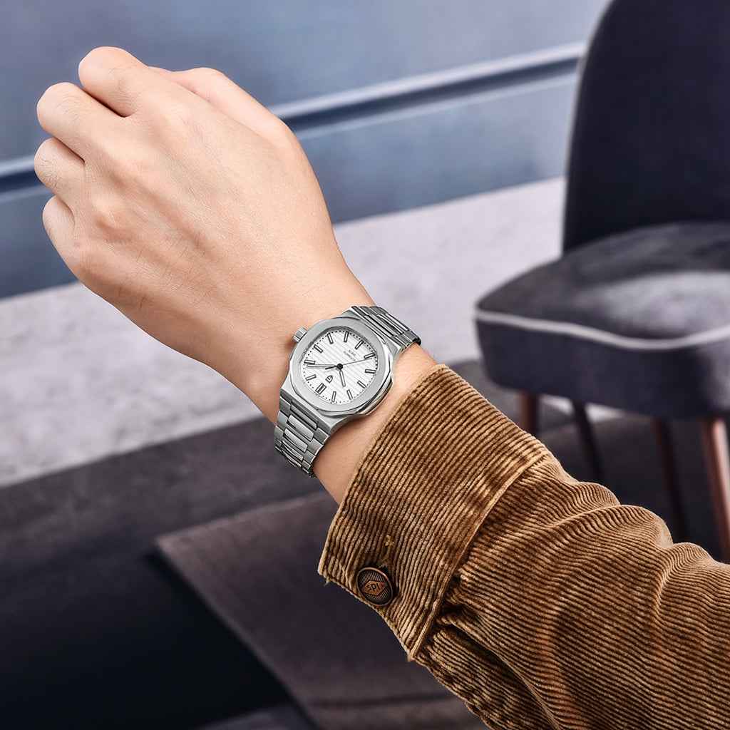 Das Armband der Pagani Design Vanguard ist sorgfältig aus Edelstahl gefertigt und bietet außergewöhnlichen Komfort sowie das Gefühl, eine fast unbemerkbare Uhr am Handgelenk zu tragen.