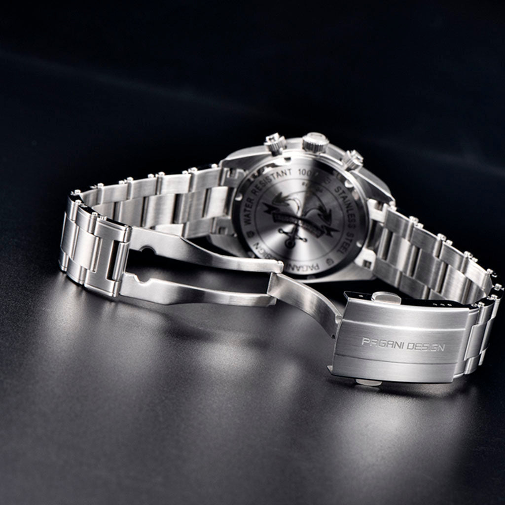 Das Armband der Pagani Design Veraci Argent ist sorgfältig aus hochwertigen Materialien gefertigt und kombiniert die Widerstandsfähigkeit und Leichtigkeit von 316L-Edelstahl. Es bietet unvergleichlichen Tragekomfort und das Gefühl, fast keine Uhr am Handgelenk zu tragen.