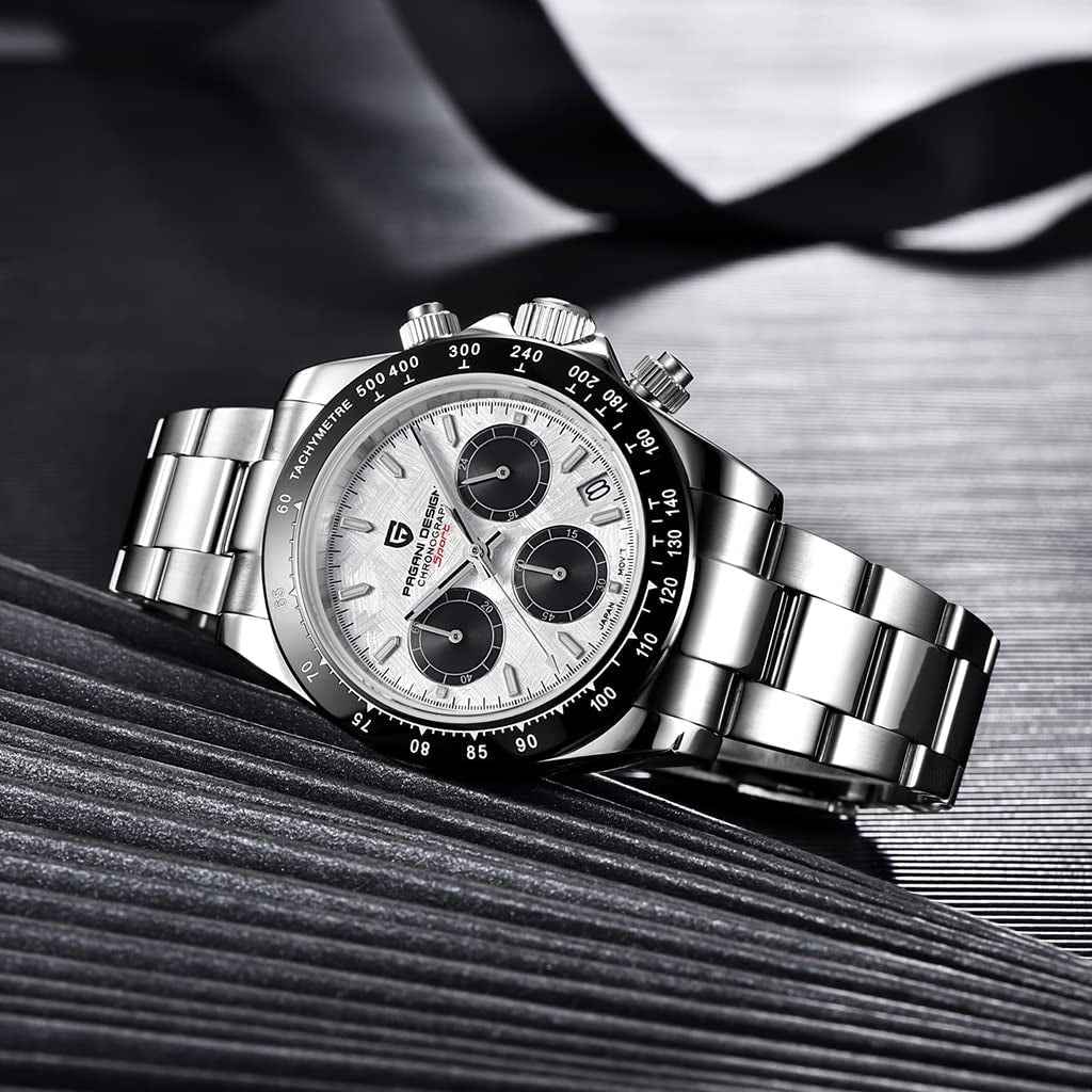 Das Seiko VK63-Werk ist bekannt für seine außergewöhnliche Präzision und Zuverlässigkeit. Die Pagani Design Aristo, ausgestattet mit diesem Uhrwerk, bietet hochpräzise Funktionen, einschließlich Chronograph und Tachymeter.
