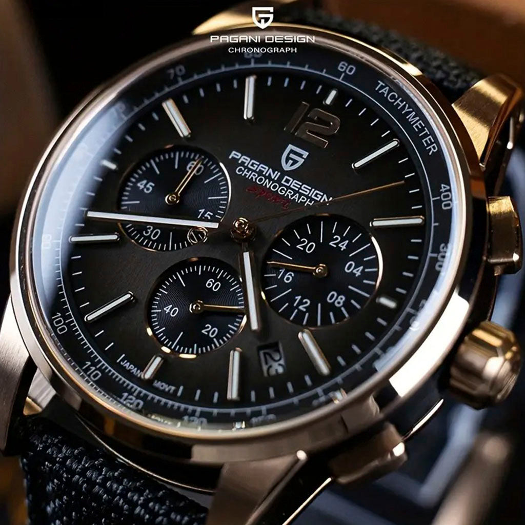 O movimento Seiko VK63 é conhecido por seu desempenho excepcional em termos de precisão e confiabilidade. O Pagani Design Zermatt Black Gold Sport Edition equipado com o movimento VK63, possui uma operação suave e precisa do cronógrafo.